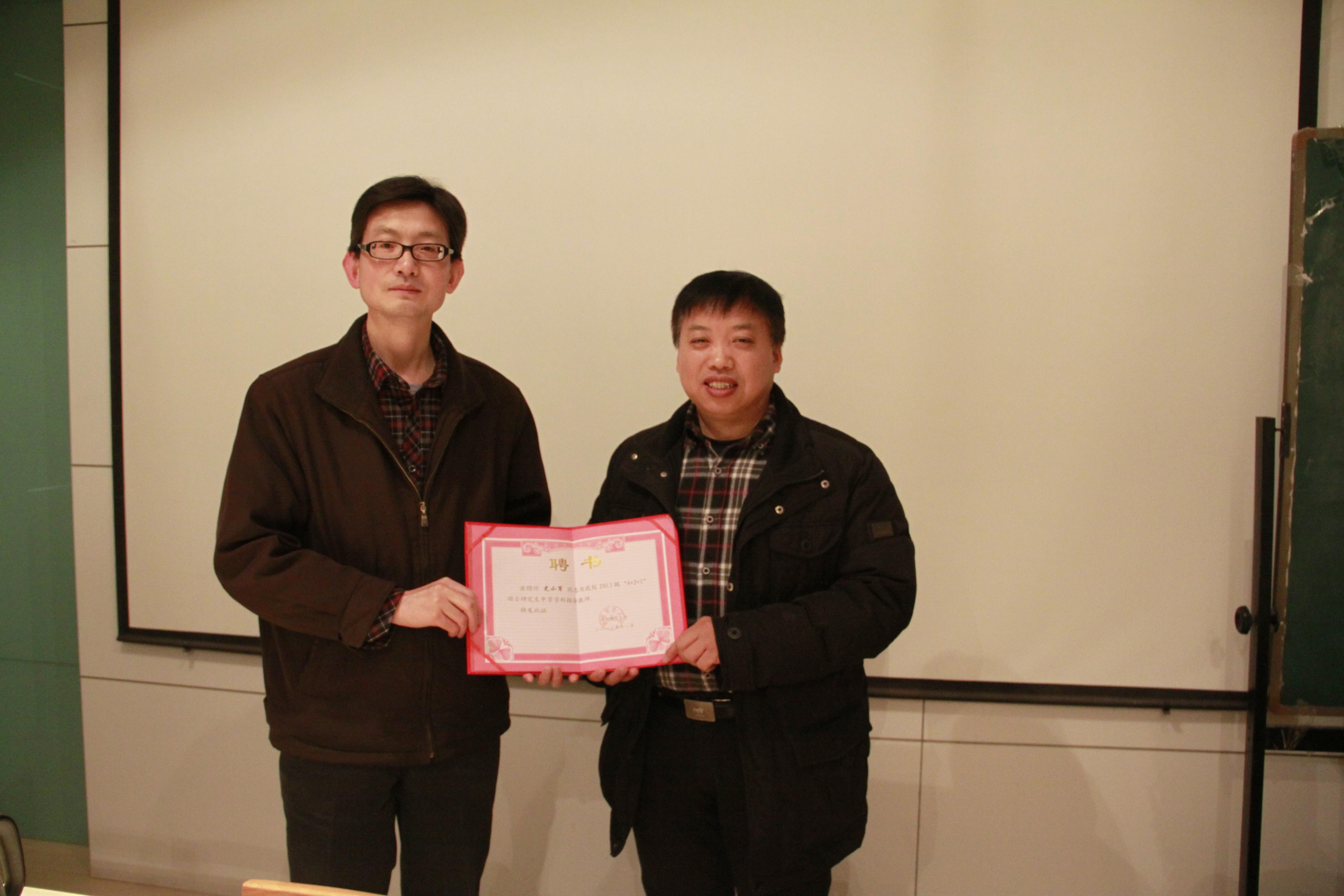 2013年12月24日下午,我院在二层多媒体教室召开了13级“4+2+1”研究生中学学科指导教师聘任仪式暨座谈会,李秉忠副院长主持了整个活动。座谈会上,何志龙院长向13级4+2+1”研究生中学学科指导教师——史小军颁发聘书...