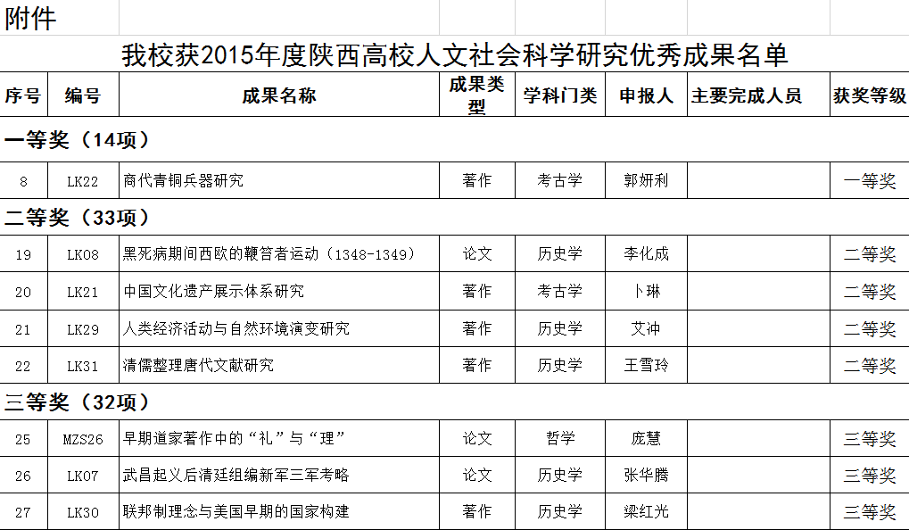 据社科处通告(http://skc.snnu.edu.cn/content.jsp?urltype=news.NewsContentUrl&wbtreeid=11262&wbnewsid=87547),我院共有八位老师荣获2015年度陕西高校人文社会科学研究优秀成果奖。具体为: &nbs...
