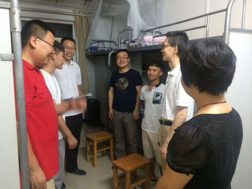 8月12日晚8时许,在结束了下午举行的新生家长见面会后,学院院长何志龙、党委副书记杜海斌一行又走进新生宿舍,看望慰问2016级本科新同学。 学院领导和老师深入学生宿舍,向新同...