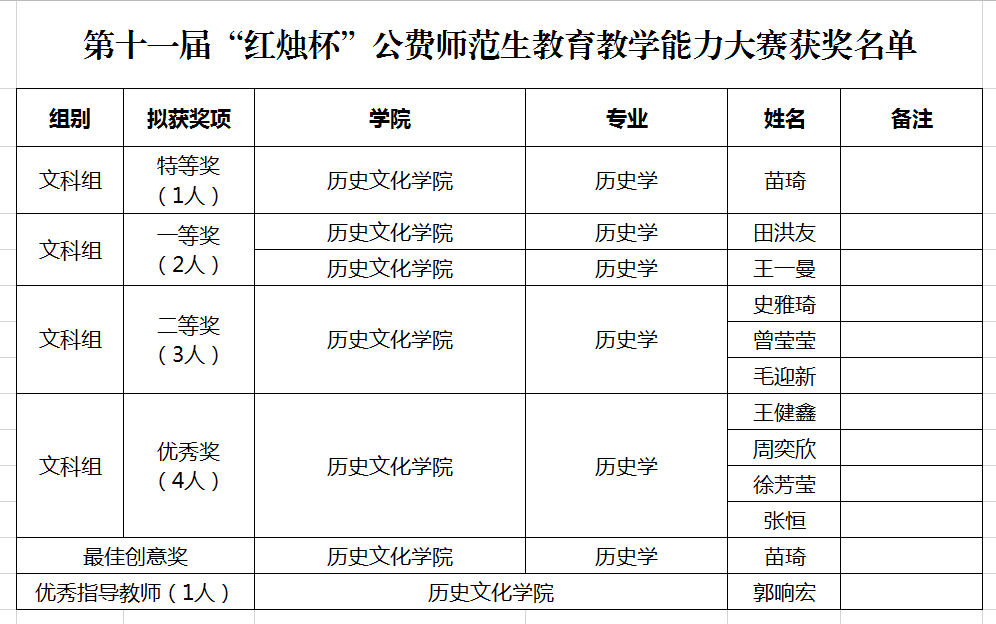 7月7日下午,学校第十一届“红烛杯”公费师范生教育教学能力大赛决赛圆满结束,我院参赛同学获得优异成绩,2017级公费师范生苗琦同学获特等奖,田洪友、王一曼同学获一等奖。郭响宏获优秀指导教师奖。 ...
