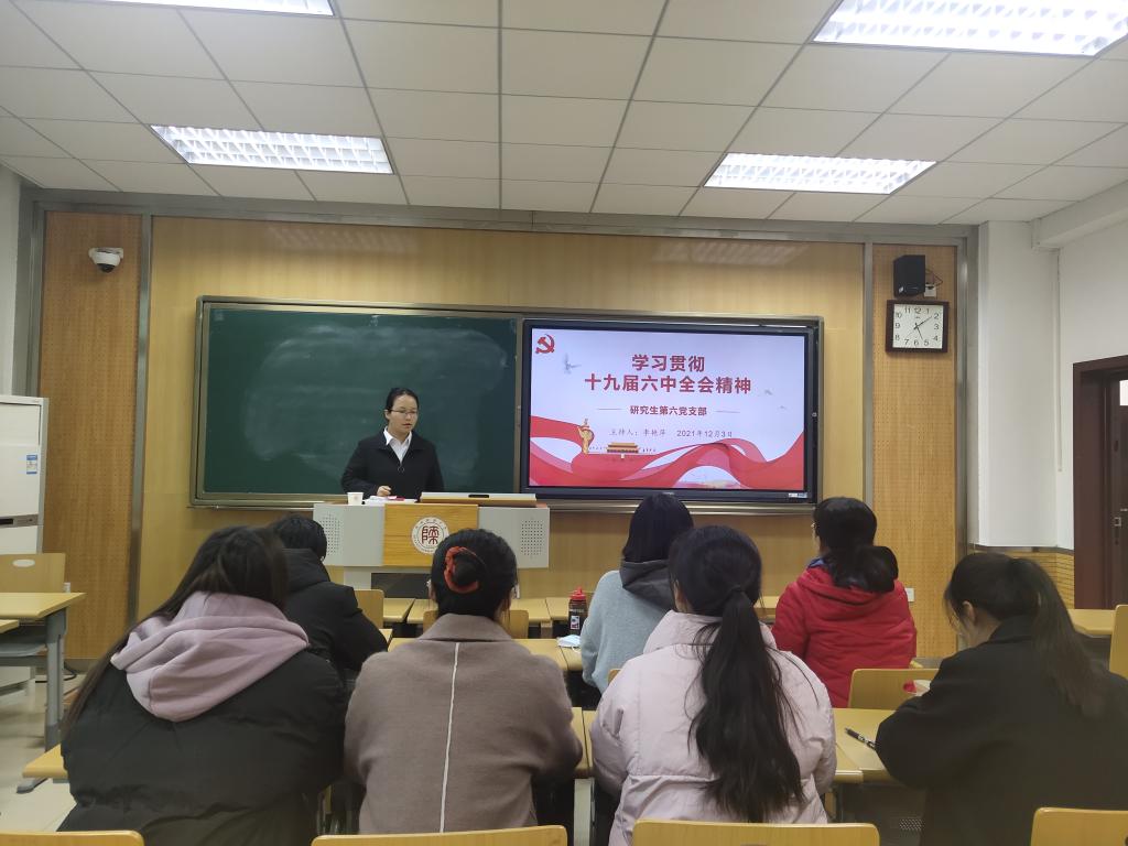 2021年12月3日,威廉williamhill体育研究生第六党支部于长安校区文渊楼1304召开“学习贯彻十九届六中全会精神”主题党日活动。本次会议主要有两项内容:一是支部书记带领大家学习十九届六中全会重要内容;二是全体党员联系工作实际发表学习心得。本次会议由支部书记李艳萍同志主持,支部党员应到18人,实到13人。