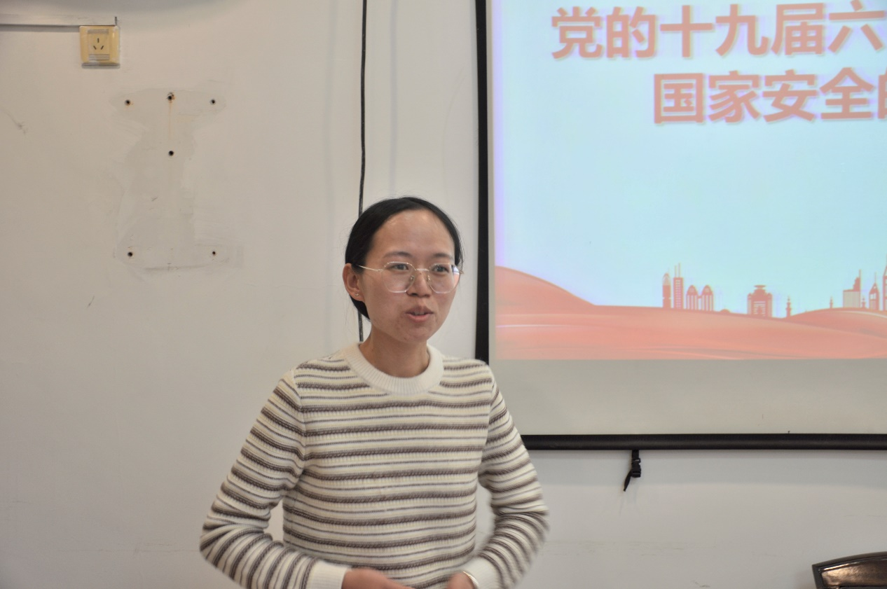 会议邀请了边疆院马克思民族理论与政策博士杨栋娟同志结合本专业知识和十九届六中全会精神进行讲学,讲学题目为:党的十九届六中全会关于边疆安全的论述,杨栋娟博士首先系统地回顾和梳理了党的十九届六中全会精神,然后结合本专业知识,紧跟时政做了深入浅出的讲学演讲。整个会议大家学习氛围高涨,积极和杨栋娟博士互动。