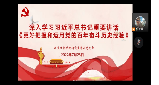2022年7月26日,威廉williamhill体育研究生第六党支部于腾讯会议(179-959-217),开展“深入学习习近平总书记重要讲话《更好把握和运用党的百年奋斗历史经验》”主题党日活动。