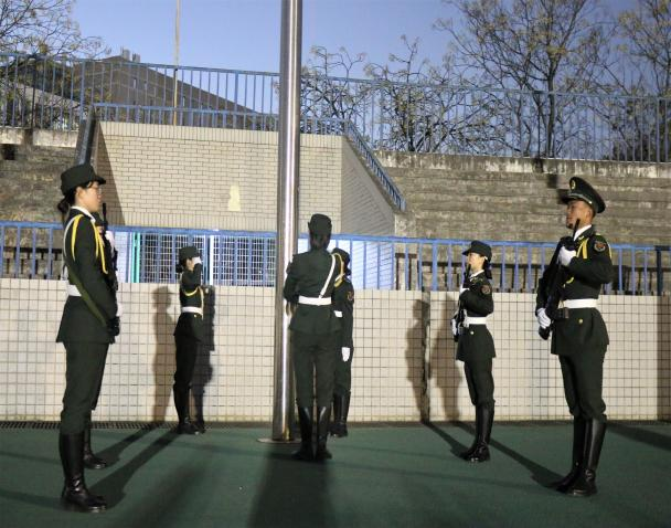 英姿飒爽的国旗护卫队队员们迎着光,踏着整齐划一的步伐,护送鲜艳的五星红旗进场。在大家的注视下,伴随着庄严的《中华人民共和国国歌》,五星红旗冉冉升起,迎风飘扬。