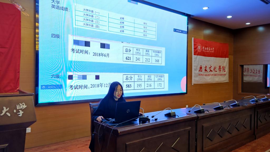 来自2018级念海史学实验班的陈璐首先向同学们分享自己的英语学习经验。她从自己的英语学习情况、四六级备考复习经验、日常英语学习建议以及推免英语面试环节经验四个方面来介绍自己学习经验,她建议大家在英语学习要学会制定计划,执行计划并及时进行反思总结,还向同学们推荐了一些英语学习的方式以及相关公众号和软件。