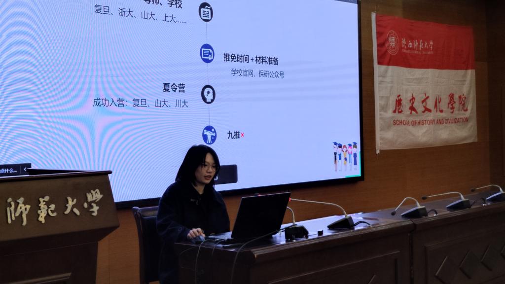 最后,保研至中国人民大学世界史方向的王昕分别从自己的日常学习,英语学习,学术经历以及保研的具体流程四个方面向同学们分享自己的经验。王昕同学推荐同学们多参加学术讲座并分享了获取讲座咨询的一系列方式,同时建议同学们参加暑期培训学校以丰富自己的阅历。