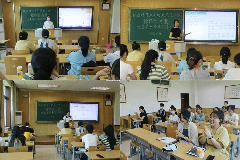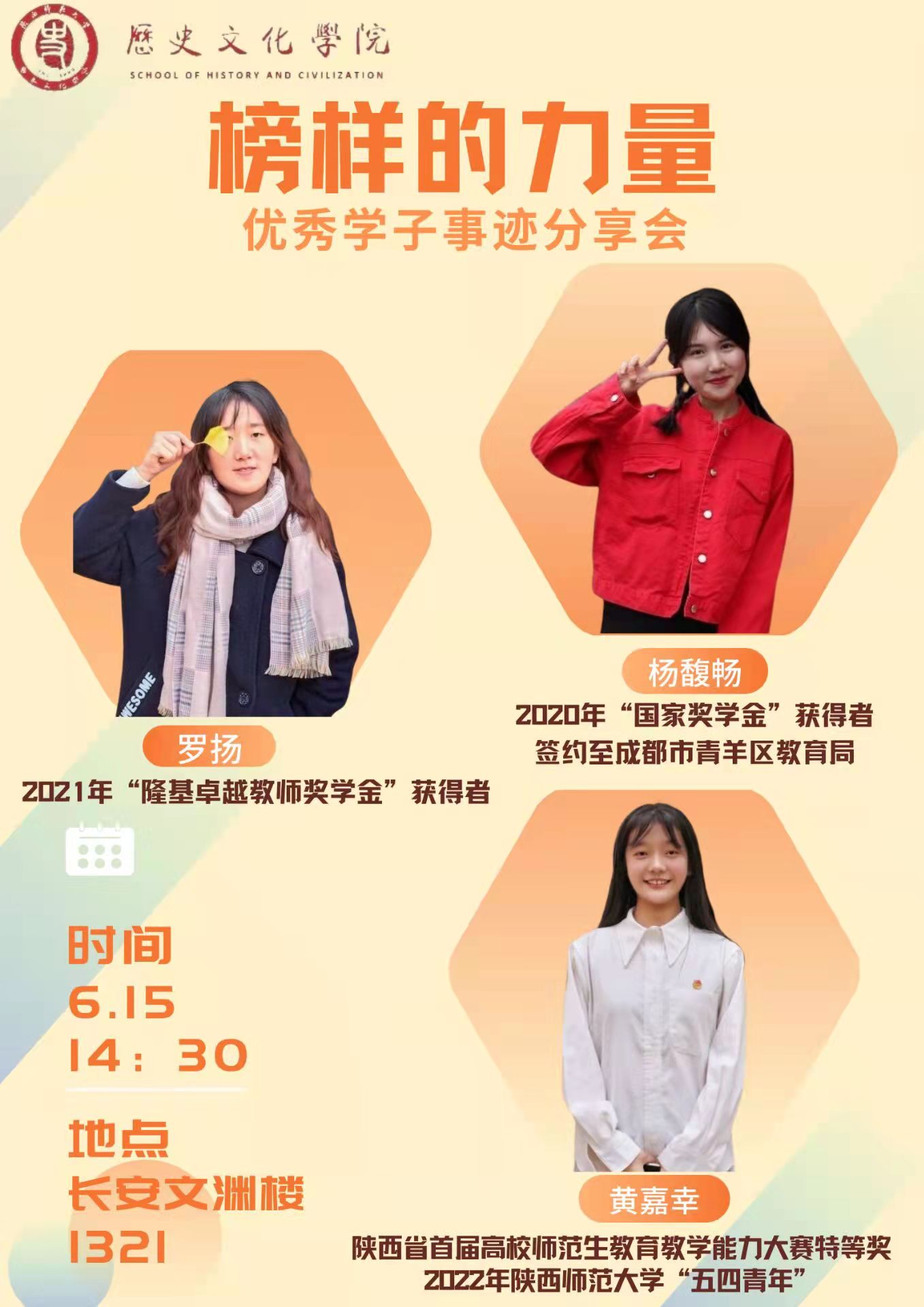 6月15日,长安校区专场分享会在文渊楼1321教室举行。国家奖学金、陕西省首届高校师范生教育教学能力大赛特等奖获得者,2019级本科生黄嘉幸分享了自己在理想信念、专业学习、学生工作、志愿服务、社会实践诸方面的经历和体会,希望同学们重视师范生教学技能训练,努力提升自我,早日成长为合格的人民教师。隆基卓越教师奖学金获得者,2019级本科生罗扬以“静心求索,漫长热爱”为题,重点分享了她对专业学习和书籍阅读的认识:“在学业上,要做到有目标,有方向,有计划,筑牢通史基础;在阅读上,应追求‘将知识还原为智慧’的境界,做到广泛阅读,拓宽眼界。”国家奖学金获得者,2018级本科生杨馥畅现已签约至成都市青羊区教育局,她根据自身学习、实习和求职的经验,从“清晰的规划”、“坚定的努力”、“积极的态度”、“大胆的尝试”四个方面分享了她大学四年的感悟,希望大家能够积极开朗地拥抱世界,真诚热烈地与人相处,多尝试新东西,从体验和经历中获得成长。