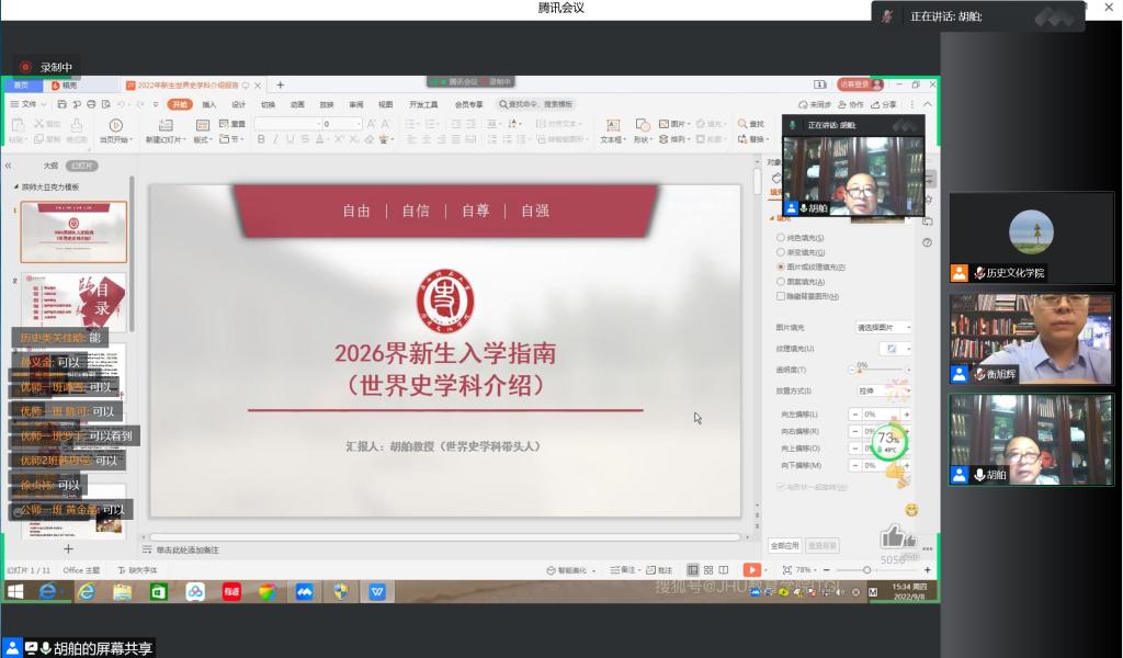 9月8日下午,威廉williamhill体育2022级新生入学教育第五讲在线上举办。胡舶教授向新生作《新生入学指南——世界史学科介绍》的主题报告,报告由党委副书记衡旭辉主持。胡舶教授对世界史专业概况、师资队伍、科学研究及教学条件及培养特色等多方面对学院世界史专业做了深入详细的介绍。他强调了学院高端的教学平台+实习基地、丰富的图书资料及中外联合培养的国际化特色,并以“胸怀世界、眼望全球、寻找真相、追求真理”寄语新生,希望同学们深耕学术领域,立志成为更优秀的历史学专业人才。