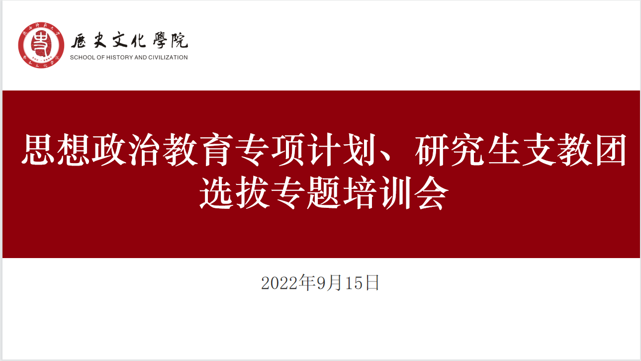 9月15日晚,我院在线举办思想政治教育专项计划、研究生支教团选拔专题培训会,历史教育学学科带头人徐赐成教授,党委副书记衡旭辉,行政副院长李晨子,陕西师范大学第23届研究生支教团成员、我院2022级中国史专业硕士研究生乔晓伟,2019级本科生辅导员张迪参加会议,会议由衡旭辉主持。
