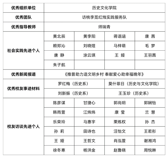 在学院党委和学院团委的指导支持下,我院暑期社会实践工作在本次评优中收获多项荣誉。其中,学院荣获“优秀组织单位”称号;访桃李觅红烛实践服务队荣获“优秀团队”称号。师瑞青获评“优秀指导教师”称号;黄北辰等13位同学获评“社会实践先进个人”称号,陈彦谋等24位同学获评“校友访谈先进个人”称号。《推普助力造文明乡村 奉献爱心助幸福晚年》获评“优秀新闻报道”;访谈罗红梅、莫什菲日、刘新振、王玉珍等优秀校友所形成的调研材料获评“优秀校友事迹材料”。