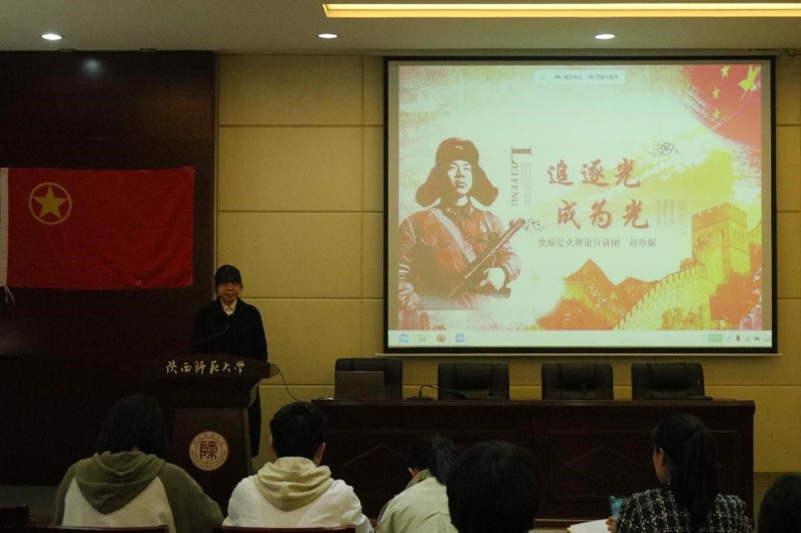 会议邀请我院“史原星火”理论宣讲团成员赵珍妮为大家进行《追逐光成为光——雷锋精神》主题宣讲,介绍雷锋的奉献、敬业和“钉子”精神,以“积小善为大善,善莫大焉”作结,号召同学们从日常点滴做起,将雷锋精神践行到实处。