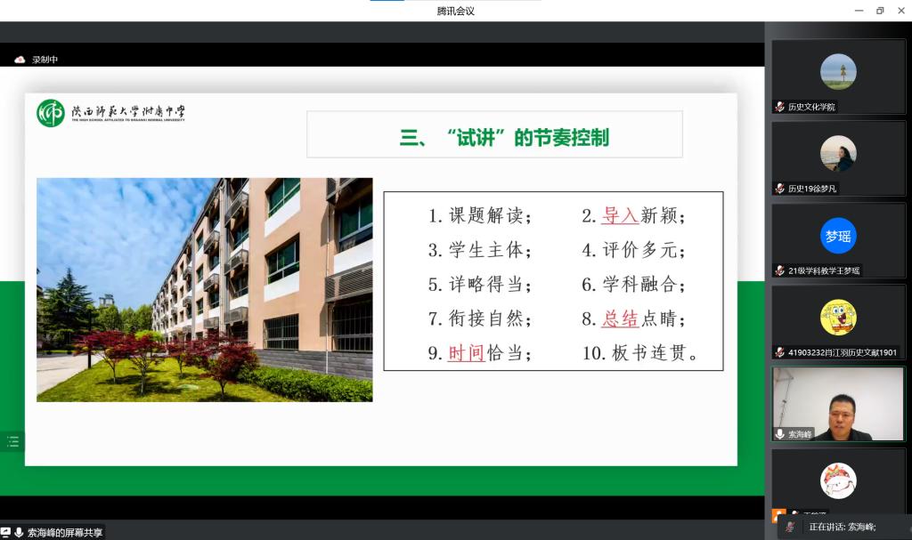 2022年11月2日晚七点,我院大学生教学技能提升训练营第二讲顺利开展。本次讲座由陕西师范大学附中校办副主任索海峰老师主讲,历史教育研究中心主任徐赐成教授主持,研究生辅导员马瑶和我院282名毕业年级本科生、研究生线上参加。