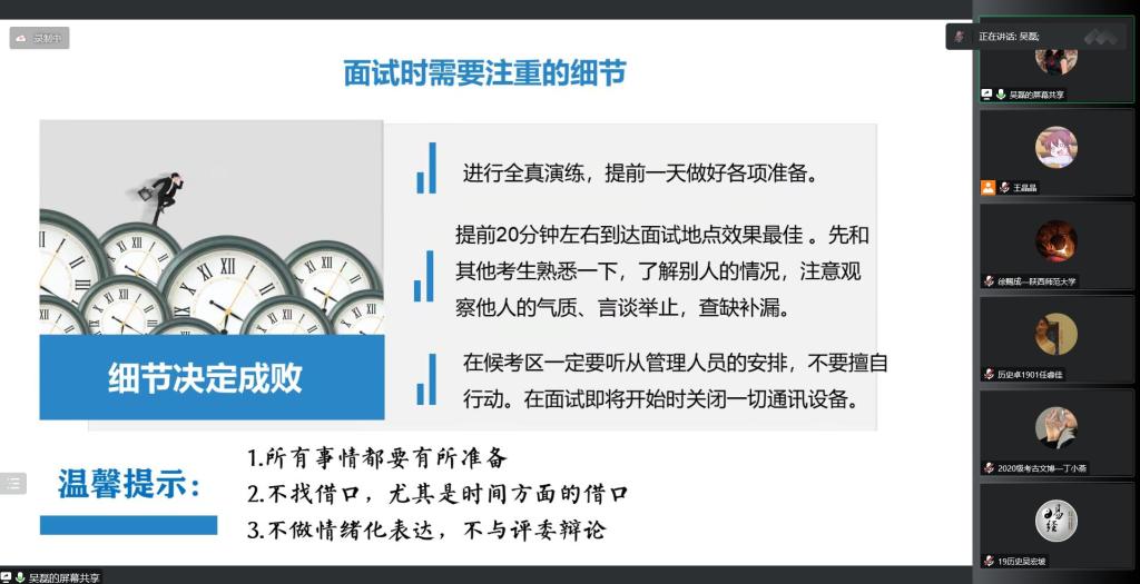 徐赐成教授作总结发言,他对吴磊老师的精彩分享表示由衷感谢,对同学们的积极参与予以鼓励。他讲到,同学们在日后应聘历史科教师岗位时应做到有效规范面试基本礼仪,行为表现更加恰当得体,从而顺利通过应聘面试环节。