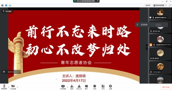 2022年4月17日19时30分,青年志愿者协会开展“前行不忘来时路,初心不改归梦处”主题团日活动。本次活动由团支书熊芯怡主持,碑林博物馆志愿服务队队长唐旖萌主讲。