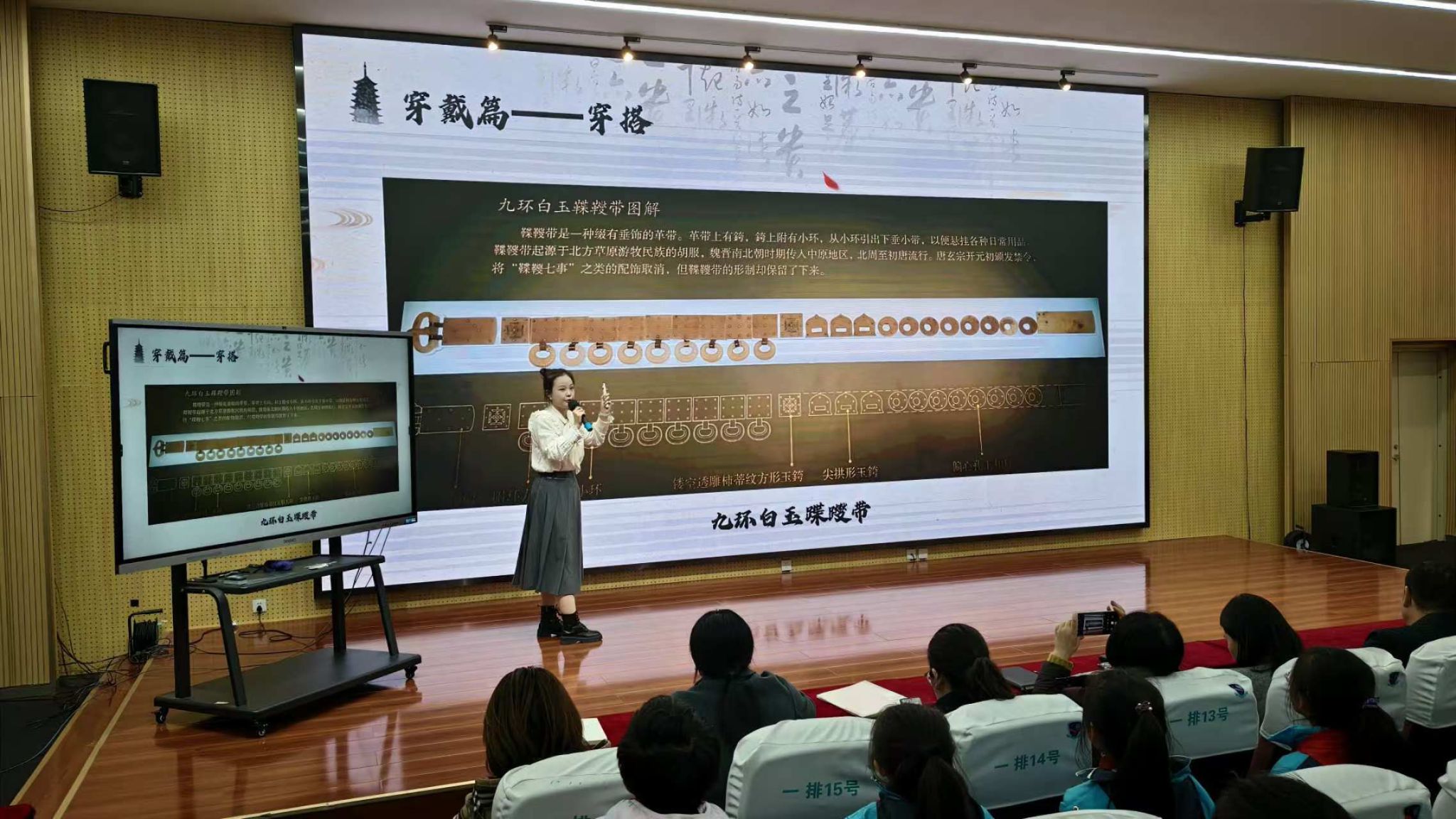 本次宣讲由学院2022级师范生钱美羲为湖居笔记小学四年级全体同学170人讲授《梦回大唐 千秋遗宝——何家村窖藏文物故事》。学院党委副书记、纪委书记、副院长李晨子,杨瑾教授,团委书记孙懿文,本科生辅导员师瑞青,宣讲团成员;郭杜街道社区负责人贺毅刚、社区党支部书记徐姣;湖居笔记小学校长屈冬宁等一并参与活动。