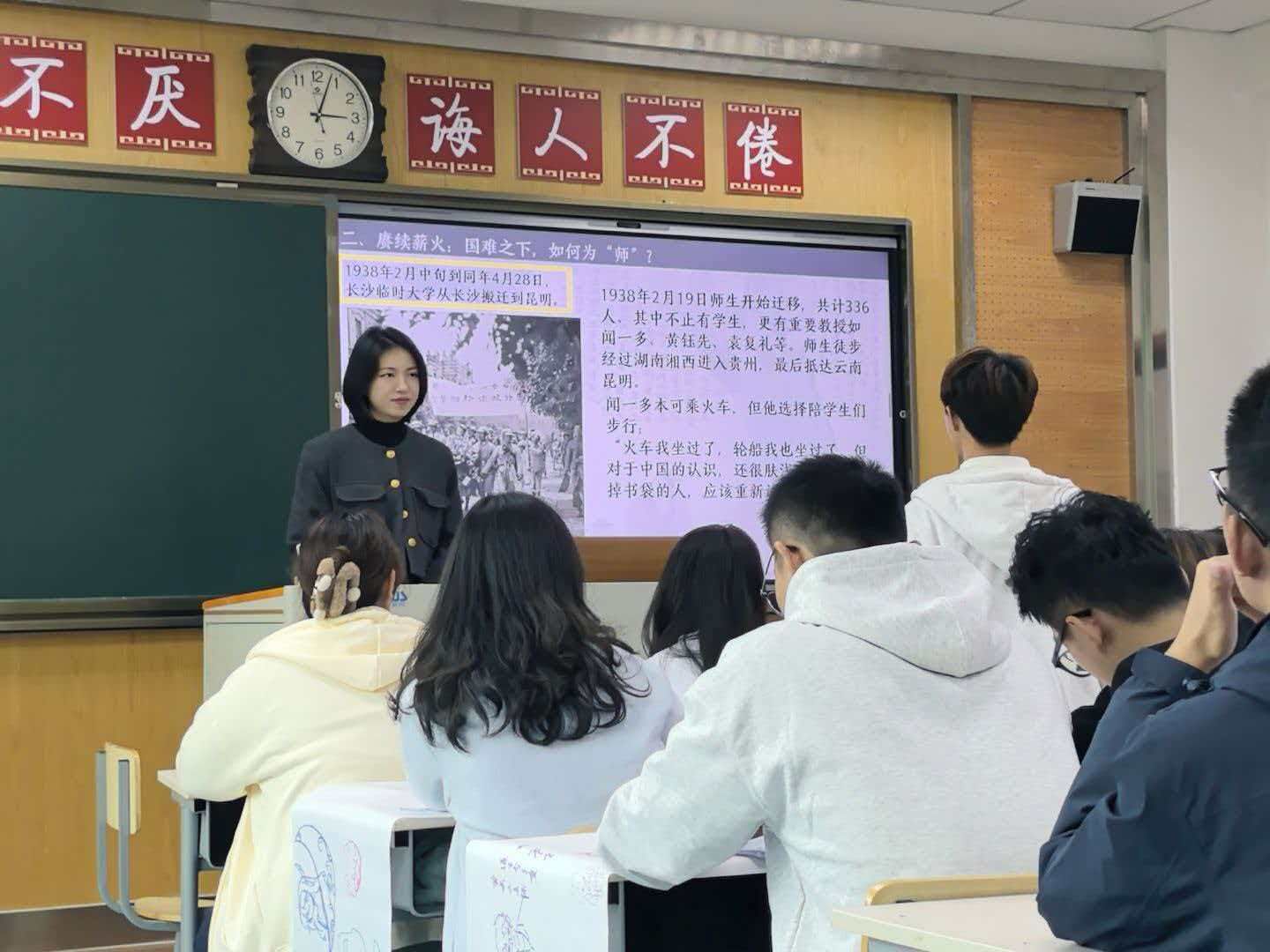 理论部分按照“古人所谓的‘师’-历史上的师风延续-新时代的四有好老师”的宣讲思路,从“师”的古代含义作为切入点,引导同学们发散思维,对历史上国难下的师风存续进行了探讨。同时借助西南联大的具体事例,让同学们对那段动荡岁月里的师者大义有了更加直观的了解。理论部分的最后,王敬瑶将同学们的视野从历史拉回当下,借助“音乐造梦家”邓小岚、“风雅先生”叶嘉莹等坚守在教学工作一线的教育工作者,向同学们普及了“四有”好老师的定义。通过这些优秀教育工作者的经历,同学们深刻感受到了教育的温度。