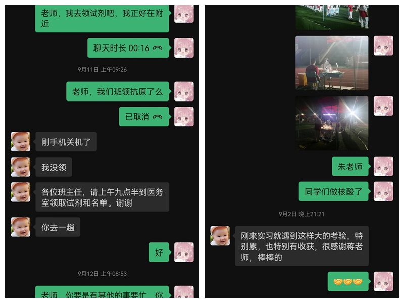 “20号夜里,是我第一次体验晚上加班。当时已经入睡的我被班主任打电话叫醒去开会,统计学生回家名单。虽然加班到凌晨两点钟,但是当名单上登记完学生全部回家的那一刻我的心情非常激动。这场校园抗疫战终于快要结束了!”侯佳坤同学在此实习经历中担任班主任助理,她分享道:“这次疫情使得我们的实习不同寻常,但也是一种特别的体验,磨练了我的意志,树立了教师的奉献精神,给我留下了宝贵的经历。就像我的指导老师所说,无论我们遇到怎样的艰苦,只要眼里有“曙光”,我们就能克服一切!”