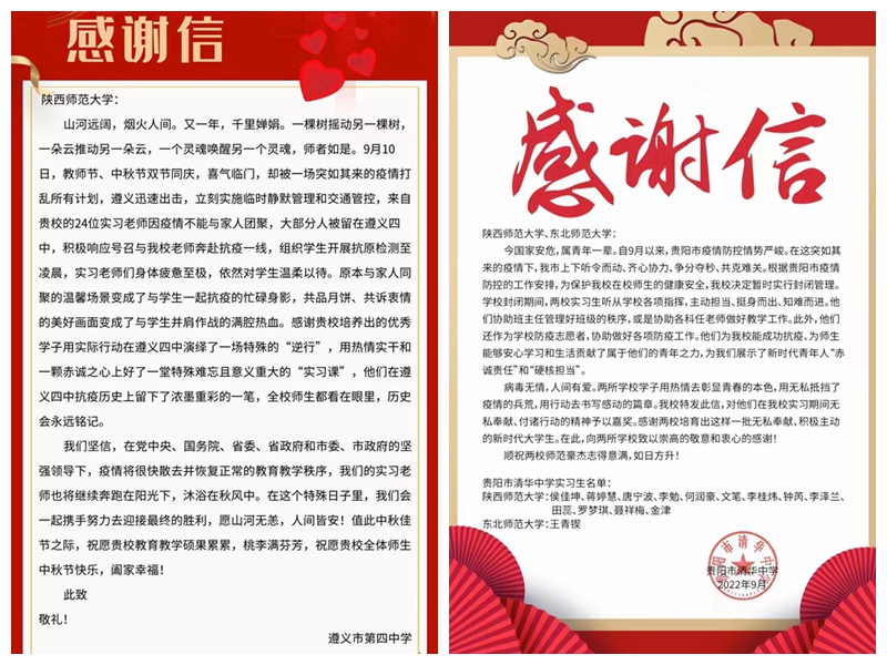 这次来贵阳与遵义实习的大都是来自贵州本地的学子。他们用实际行动诠释了国家公费师范生应有的家国情怀和担负的教育责任,用自身的努力和担当弘扬者革命老区的精神,传承着红色基因。遵义市第四中学与贵阳市清华中学专门发来感谢信,为陕西师范大学的实习老师和带队老师“点赞”,称赞他们这一场特殊的“逆行”,真正用热情实干和赤诚之心上好了一堂特殊难忘且意义重大的“实习课”!