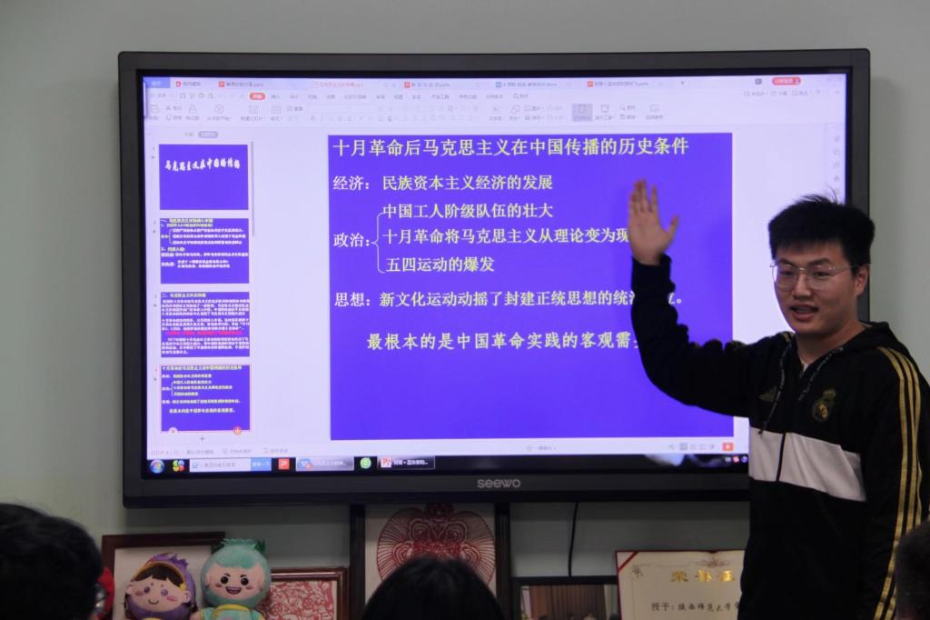 贺永业学长从“明晰教材知识,分析教材脉络”“依据课标要求,了解课程重难点”“明确课程目的,探索教学新趣”三个方面讲述备课环节的注意事项。贺永业学长说,在有限的课时中要将课程重难点讲精确明白,需要精读研读细读历史课程标准,理清教学思路和方法,同时注意课件设计内容的选择,在准确把握教学目标基础上,力图求“新”求“趣”,通过精心设计的课堂互动以及趣味化的讲课方式,有效调动学生的积极性和参与度,完成教学任务。