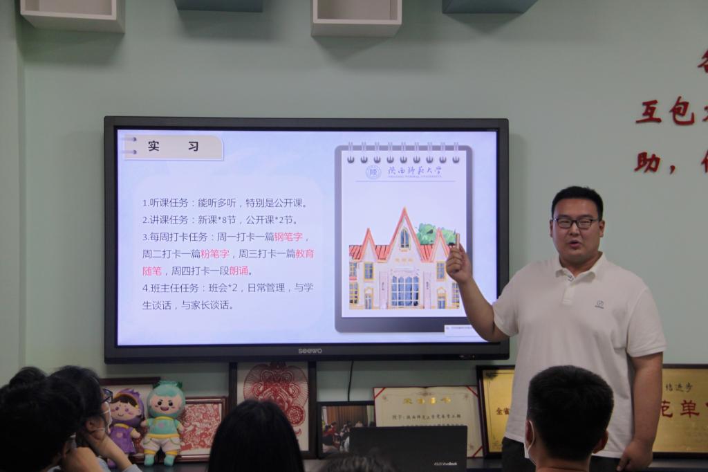 孟泳言学姐从“导入”“板书”和“实习经验”三个方面入手,结合课堂实例更加细致地进行了分享:“导入”关系到教学过程的完整性,在实际教学中引人入胜的导入可以激发学生对学习文本的兴趣,对教学效果起到事半功倍的效果。而一个好的导入应当紧扣课文内容,符合学生学情,根据学生历史水平和认知能力的高低确定导入程度的深浅,同时要注意把控导入环节的时间。好的板书是一份微型教案,其中主板书需要课前设计,副板书是讲课中的说明性文字,服务于课程内容和主板书。教学板书的基本要求是具有明确的目的性、周密的计划性、清晰的条理性、一定的启发性和较强的美感,基本原则是书写规范、语言准确和提纲挈领。在实习过程中要认真完成练习,参加教研活动,吸取指导老师建议,积累实践经验。