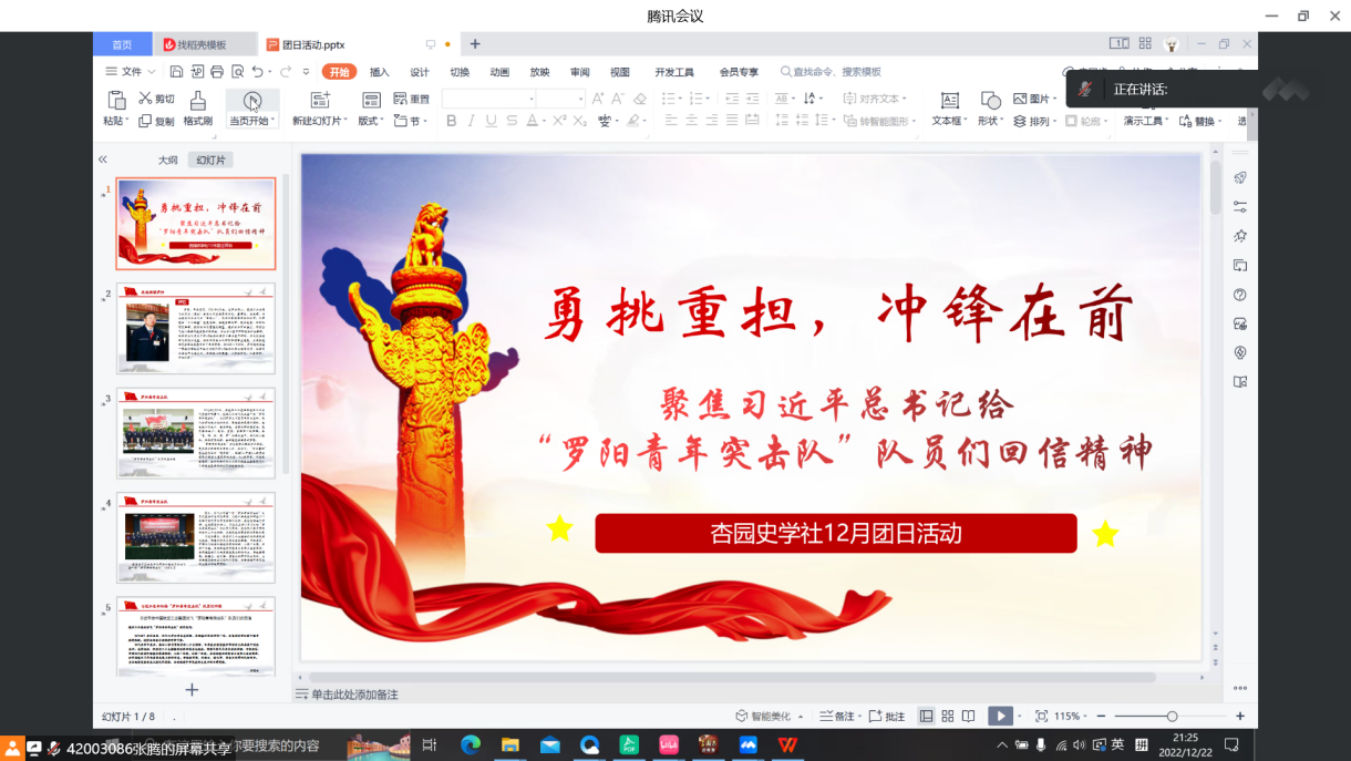 12月22日,杏园史学社团支部响应校团委号召,适时组织支部成员举办“勇挑重担,冲锋在前”主题团日活动。团支书张腾带领支部成员学习习近平总书记给“罗阳青年突击队”队员们的回信精神,社长张饮寒进行简短总结。本次学习帮助支部成员树立了新时代正确的风向标,为支部成员提供了新时代前进的新动力。
