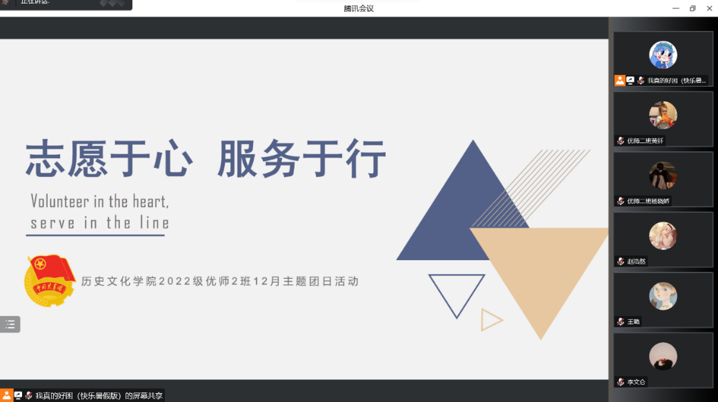 为进一步弘扬志愿服务精神,动员广大青年积极投身新时代志愿服务事业,12月25日晚,2020级历史学一班、二班和卓越教师实验班团支部联合开展“青春奋进新时代,志愿服务我先行”示范主题团日活动。历史学卓越教师实验班团支书刘晓煜围绕国际志愿者日的由来、内涵和主题进行详细阐述。团委副书记黄李阳带领支部成员共同学习《高校共青团青年志愿服务工作指引》,并为支部成员分享学院及年级志愿服务整体情况。2020级历史学一班团支书谭诗颖作为代表分享工作心得。活动最后,2020级本科生辅导员师瑞青肯定了年级志愿服务工作的优秀成果。支部成员备受鼓舞,立志以青春力量努力践行志愿服务精神。