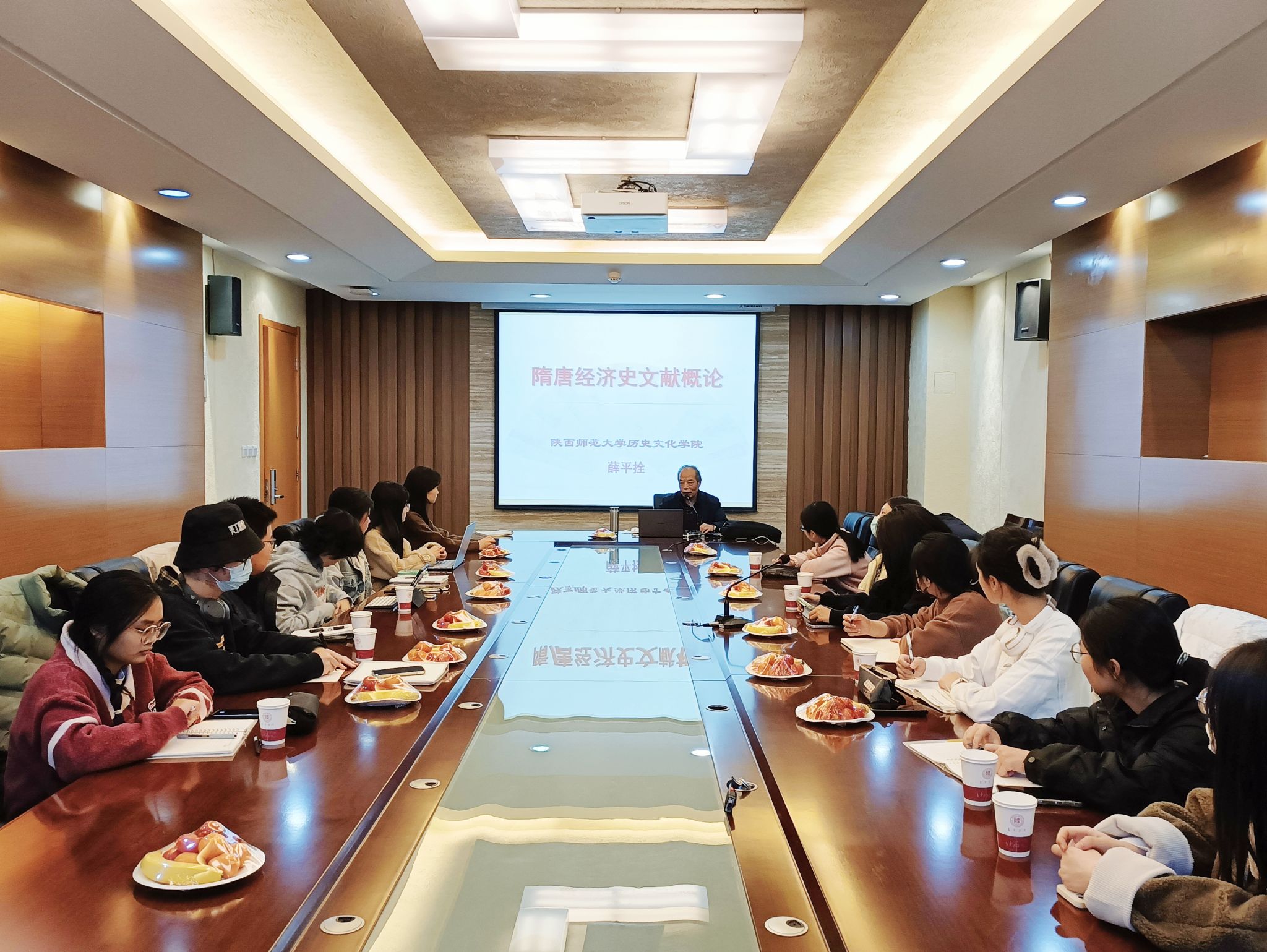 随后,薛平拴以史料文献为导入,从编纂方法与原则、体例与结构等三个方面对《旧唐书·食货志》和《新唐书·食货志》进行比较,综合学术界观点,指出两部文献各有特色、互为补充。此外,薛平拴向同学们介绍了《通典·食货典》《唐会要》《册府元龟》《元和郡县图志》《新唐书·地理志》《长安志》等十余部研究隋唐经济史的参考文献及版本。在师生互动环节,薛平拴就同学们的论文写作提供指导,并分享了唐耕耦、陆宏基《敦煌社会经济文献真迹释录》1—5辑,希望同学们从中学到学者的研究方法,还鼓励同学们要敢创新,能形成新的研究思路。
