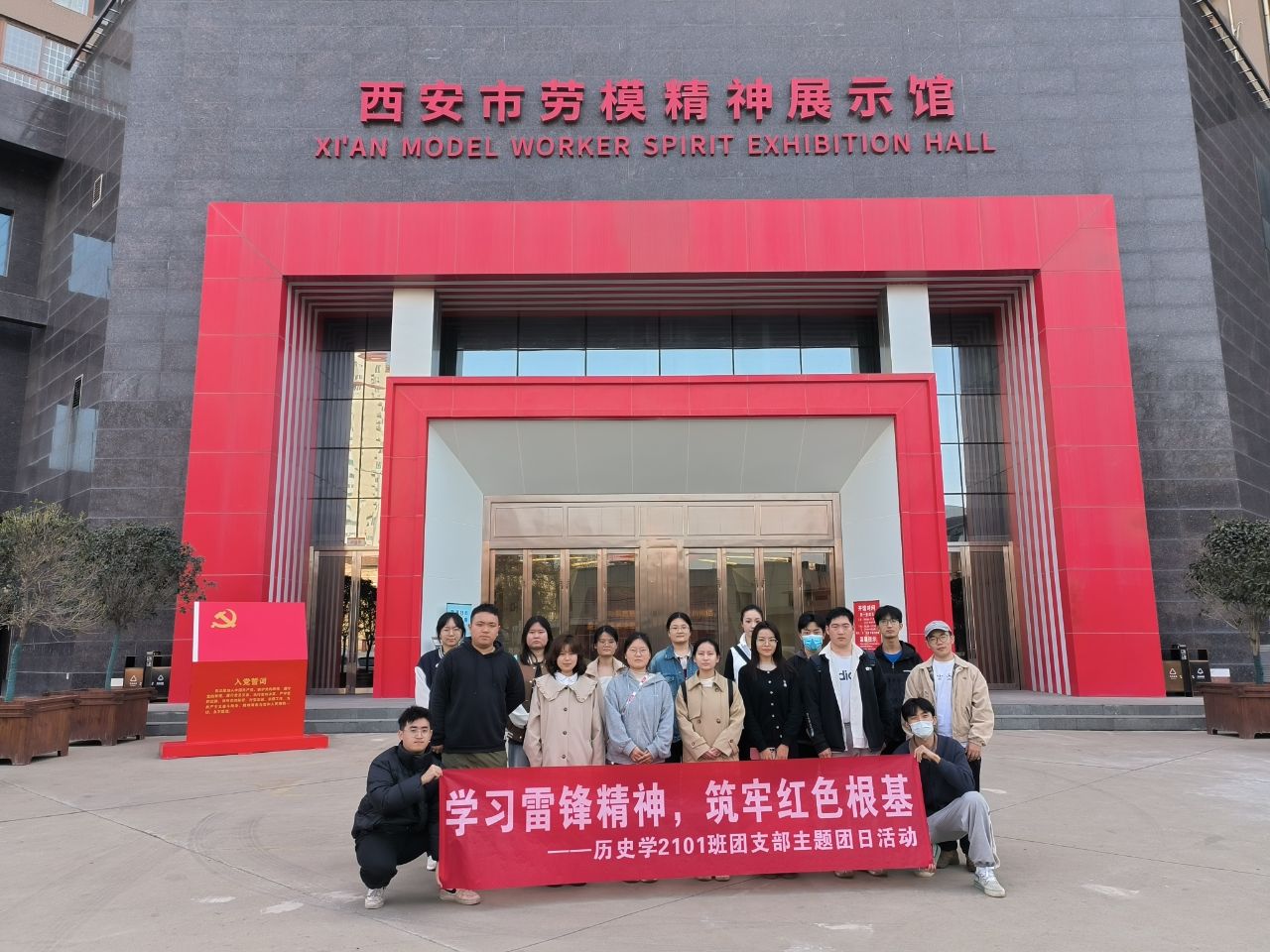 3月20日,2021级历史学1班团支部开展“学习雷锋精神筑牢红色根基”主题团日活动。支部成员共同学习雷锋同志事迹,追忆雷锋精神,齐唱《学习雷锋好榜样》,并分享自己的志愿服务故事及身边的“活雷锋”。部分支部成员走进西安市劳模精神展示馆参观学习,近距离感受劳动模范的光辉事迹和伟大精神。