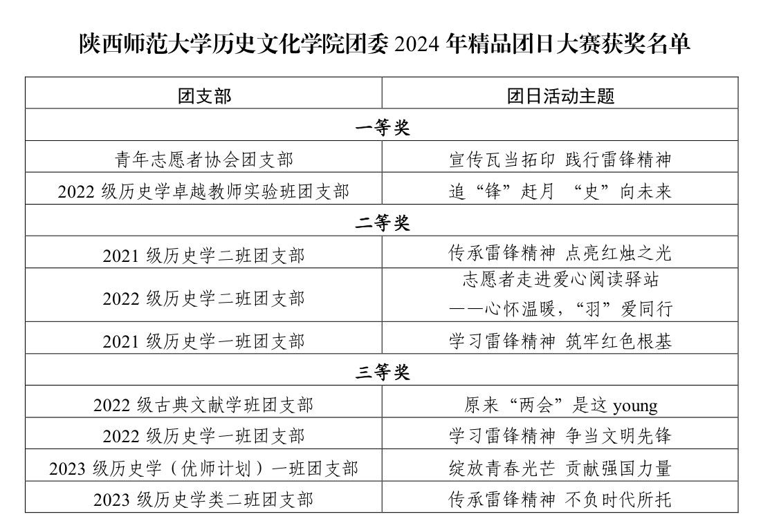 为进一步从严落实“三会两制一课”制度,促进基层团组织活力提升,充分发挥共青团育人优势,发挥主题团日活动的思想引领作用,结合校团委《关于开展陕西师范大学“传承雷锋精神点亮红烛之光”学雷锋主题教育实践活动的通知》精神,我院团委组织开展2024年精品团日大赛。大赛共收到52份参赛作品,现对部分优秀成果进行展示: