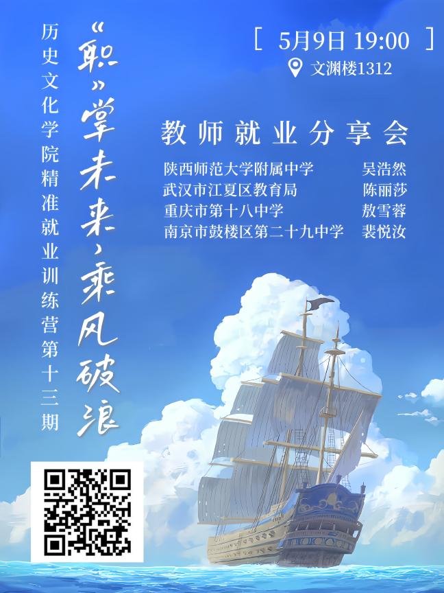 为加强精准就业指导,2024年5月9日,我院于文渊楼1312面向2025届毕业生举办了威廉williamhill体育精准就业训练营第十三期——教师行业就业经验分享会。本次分享会邀请我院2024届毕业生分享求职经验,分别是吴浩然(陕西师范大学附属中学)、陈丽莎(武汉市夏江区教育局)、敖雪蓉(重庆市第十八中学)、裴悦汝(南京市鼓楼区第二十九中学)。