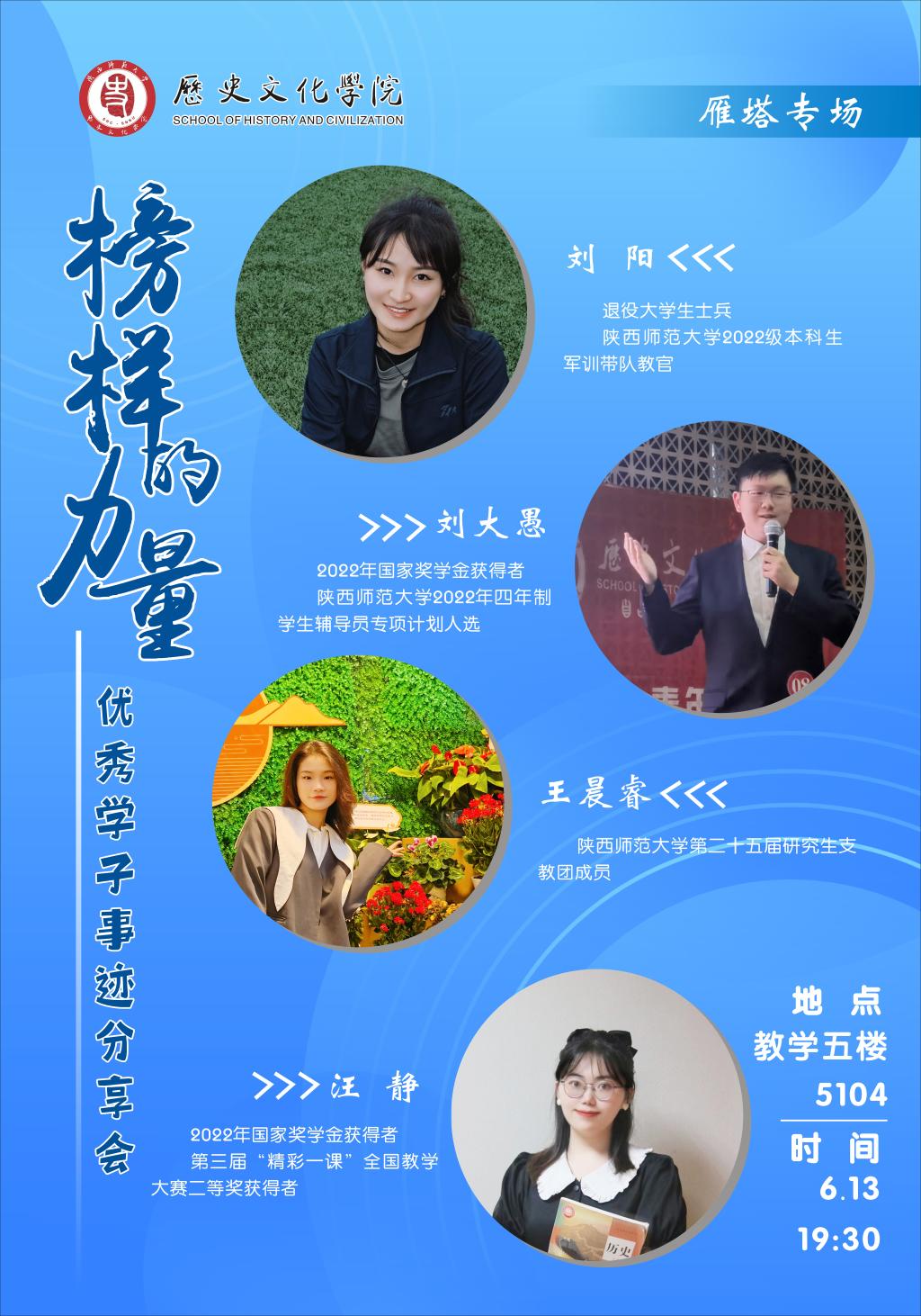 在雁塔专场,退役大学生士兵,学校学生军训优秀带队教官,2020级本科生刘阳讲述了自己的入伍初心和军旅生涯给自己带来的改变,以“报国参军,无上光荣”的感召鼓励同学们积极参军入伍,以“人生只一次,尽志而无悔”的感悟激励同学们奋进求学;国家奖学金获得者,学校2022年四年制学生辅导员专项计划人选,2019级本科生刘大愚分享了四年大学生活的精彩点滴,就选择申报辅导员专项计划畅谈了内心的想法,希望同学们能够以向上、坚定、自然的心态对待每一次成长和收获;以“追求源于热爱,热爱成就追求”为题,学校第二十五届研究生支教团成员,2019级本科生王晨睿为同学们介绍了研究生支教团项目的招募政策、选拔流程和培训经历,并与同学们分享了自己关于专业学习的方法和资源;国家奖学金获得者,第三届“精彩一课”全国教学大赛二等奖获得者,2020级本科生汪静用“逆风而行,向阳而生”概括了自己初入大学后从迷茫懈怠到自律自强的转变过程,结合国赛参赛经验分享了关于师范生能力素养提升的见解,倡导同学们身处逆境时学会正视困难、接纳缺憾、反思问题,进而明确成长目标,提高执行能力,遇见更好的自己。