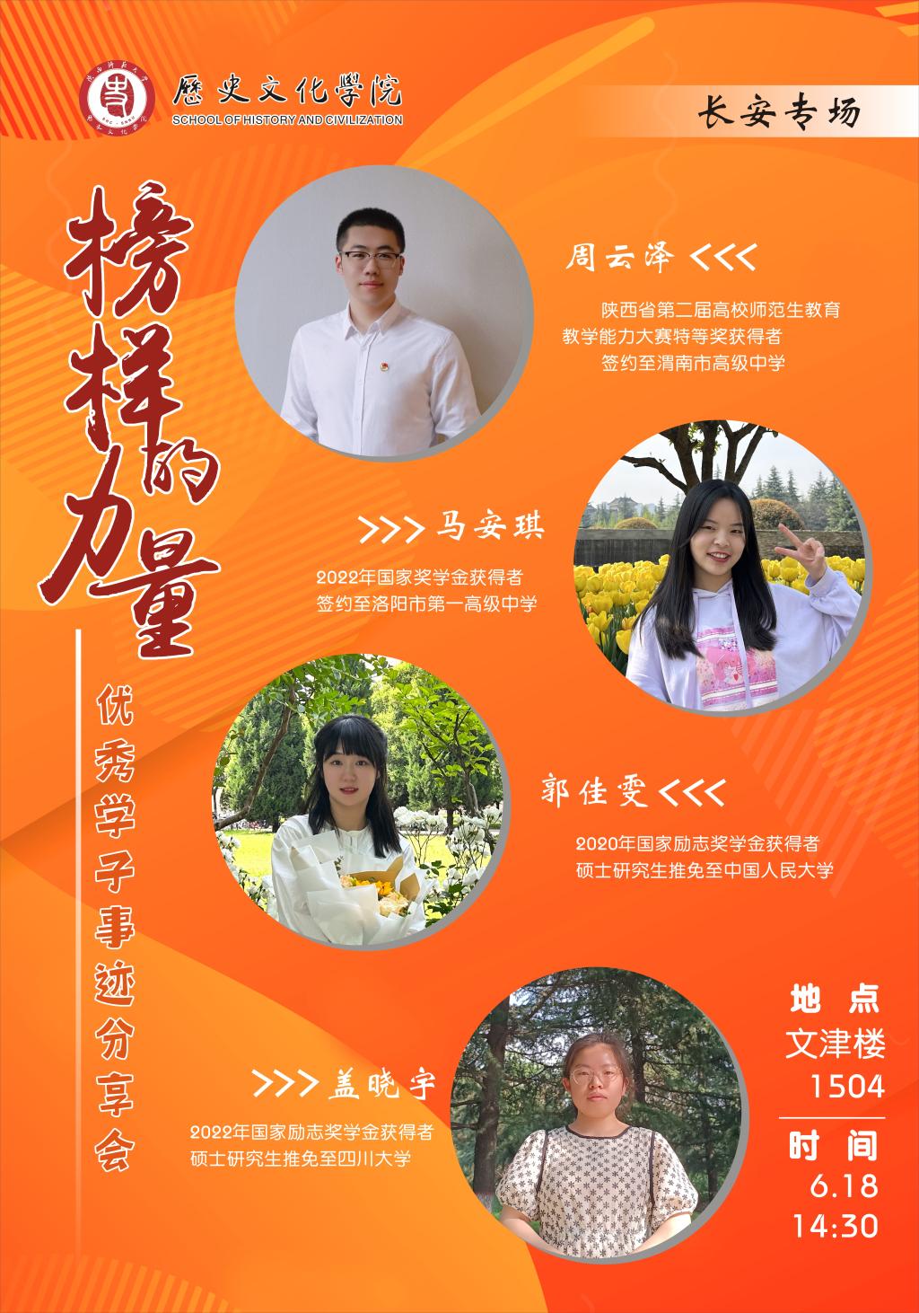 在长安专场,国家奖学金获得者,签约至洛阳市第一高级中学的2019级本科生马安琪从师范生的专业学习、职业技能、综合锻炼和实习工作四个方面为同学们提出建议,希望同学们能够脚踏实地地成长为一名合格的人民教师,度过充实的大学时光;国家励志奖学金获得者,硕士研究生推免至中国人民大学的2019级本科生郭佳雯以“所由所向皆是远方”为分享主题,详细介绍了获取专业学习资源和考研保研资讯的多种渠道,围绕专业知识基础、论文写作能力、备考时间规划、压力心态调整等方面对自己的保研经历进行了回顾;国家励志奖学金获得者,推免至四川大学攻读硕士研究生的2019级本科生盖晓宇对照时间线重点介绍了研究生推免各个环节的主要内容和注意事项,勉励同学们做足前期准备,坚定专业自信,克服竞争焦虑,正确看待结果;不久前在陕西省第二届高校师范生教育教学能力大赛获特等奖的2019级本科生周云泽现已签约至渭南市高级中学,他以“机会是留给有准备的人”“一枝独秀不是春,百花齐放春满园”“工欲善其事,必先利其器”“遇事不决,干了再说”畅谈自己的心路历程,寄语学弟学妹们在青春赛道上奋力奔跑,并把沿途的风景作为更重要的收获。