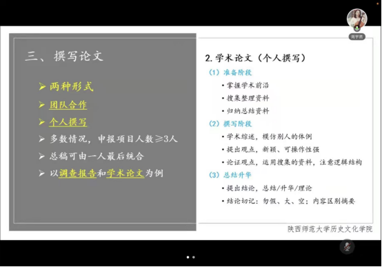 周宇燕学姐以《浅谈:如何撰写科研小论文(申报项目)》为题,结合自己的经验从三方面为我们分享了具体的论文写作建议。一是确定主题,选择切合申报通知的主题,在平时积累中选择兴趣点,大致确定研究方向,立论观点新颖。二是筛选材料,熟练运用多个学术网站查阅文献史料例如“全球学术快报”,“中华经典古籍库”等,查阅之后,进行资料处理。三是撰写论文,可以选择团队合作或是个人撰写,做足前期的调查报告,让论文内容落到实处,切忌泛泛而谈,要关注细节,语言精炼,文章做到短小精悍;最后学姐建议大家,可以进行一些有趣的实地调查,找到自己的兴趣所在,并以此为契入点开展学术研究活动。