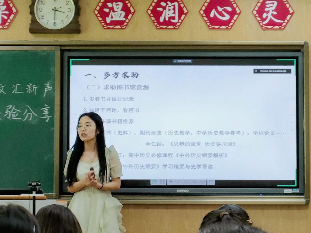 汪静以“当我们走上讲台”为题,强调“走上讲台前”应当对学生学情进行分析,要在教材解读基础上进行教学设计,“以史学为基础”、“以课标为导向”、“以观点为补充”,有所选择地呈现PPT的内容,着装上也应有所注意。关于“走上讲台时”怎样展现出一节符合预期的课,汪静认为师范生应当具备一定应变、表达、书写技能,以较为理想的个人状态与学生进行自然合适的互动,鼓励同学们以史为基、以生为本、以教促学。