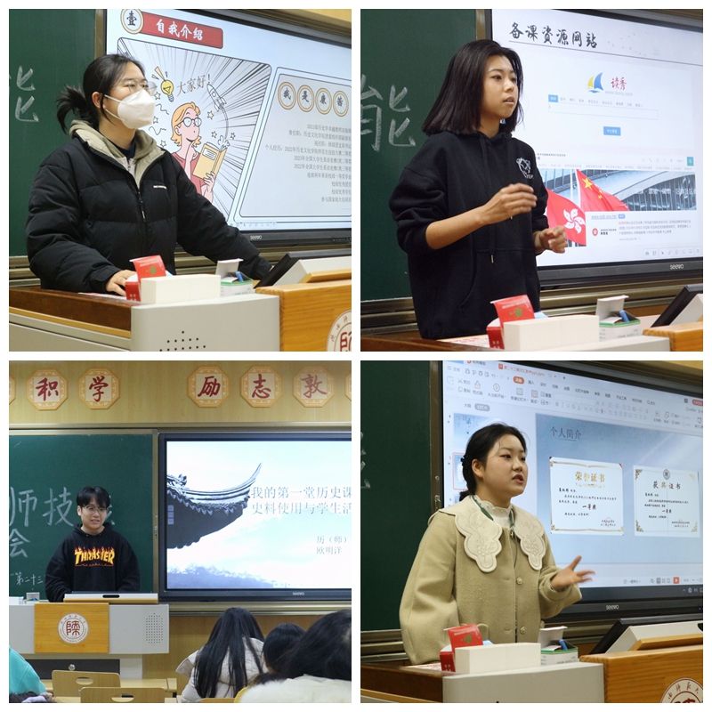夏秋彤介绍备课时的切入点,详细阐述收集材料、整合内容、设计教学过程等练课环节。康茜围绕主题“成为教师的努力”,强调核心竞争力的重要性,作为未来的人民教师,我们既要不断拓展知识眼界,熟练掌握专业知识,又要精进授课技能,提升综合能力。欧明洋强调在史料搜集和选择时,要鉴别真实性、有效性,还要考虑学生的年龄、兴趣和认知水平。在设计学生活动时,他建议关注活动与课程内容的相关性和可操作性。高梦瑶介绍讲课过程应具备个人风格,关注学生的需求和兴趣倾向,让课堂成为学生的舞台。