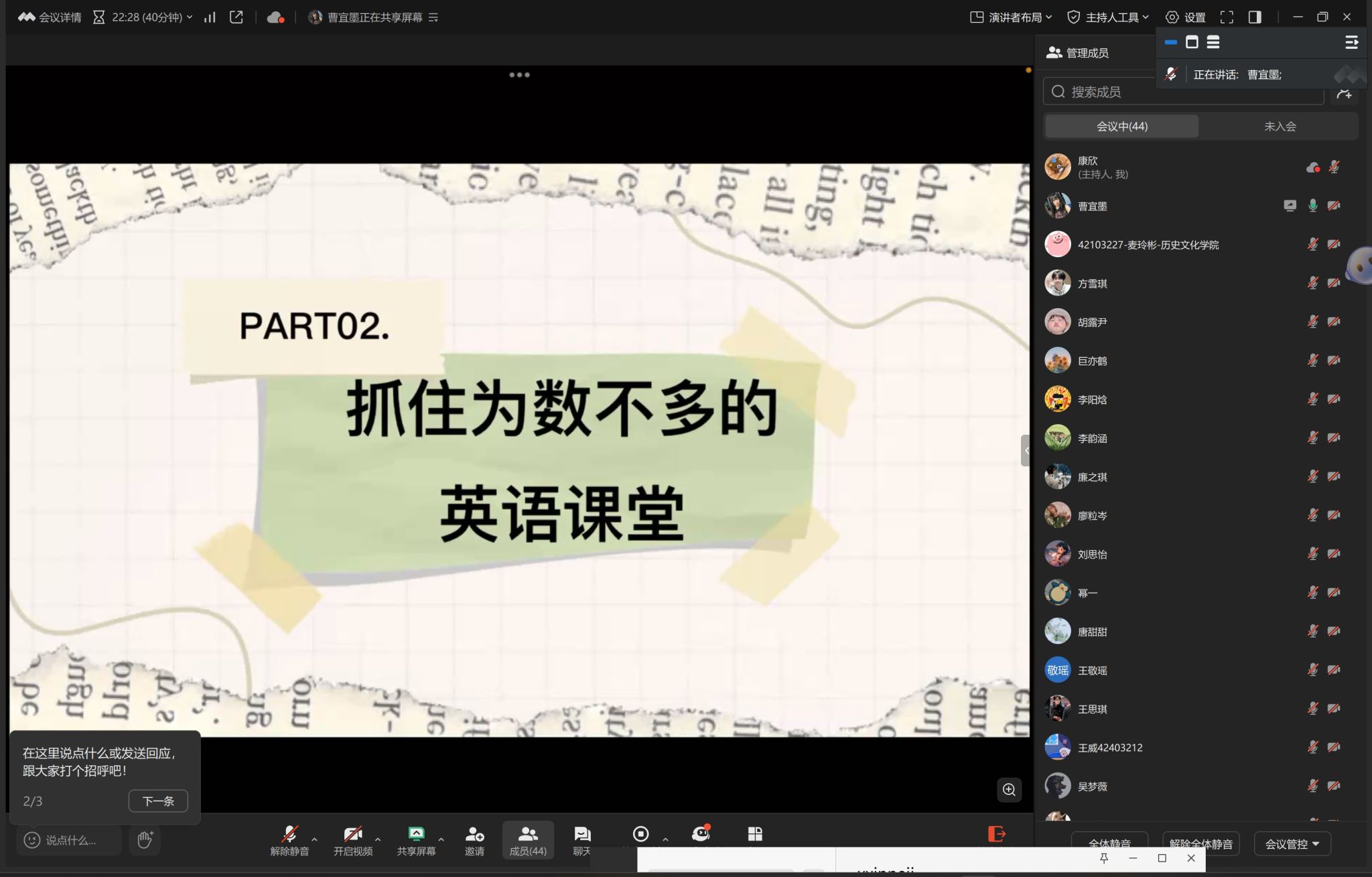 活动伊始,曹宜墨阐述了词汇积累在英语学习中的核心地位,鼓励同学们通过日常交流提升口语能力,并推荐大家借助影视、音乐等方式辅助学习。