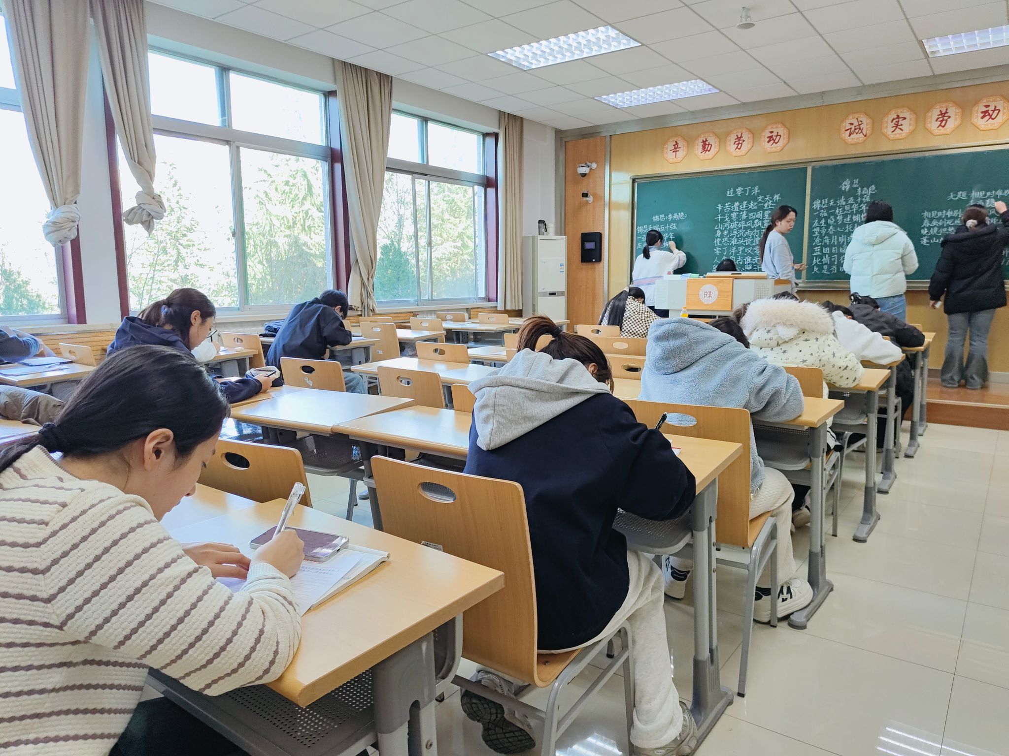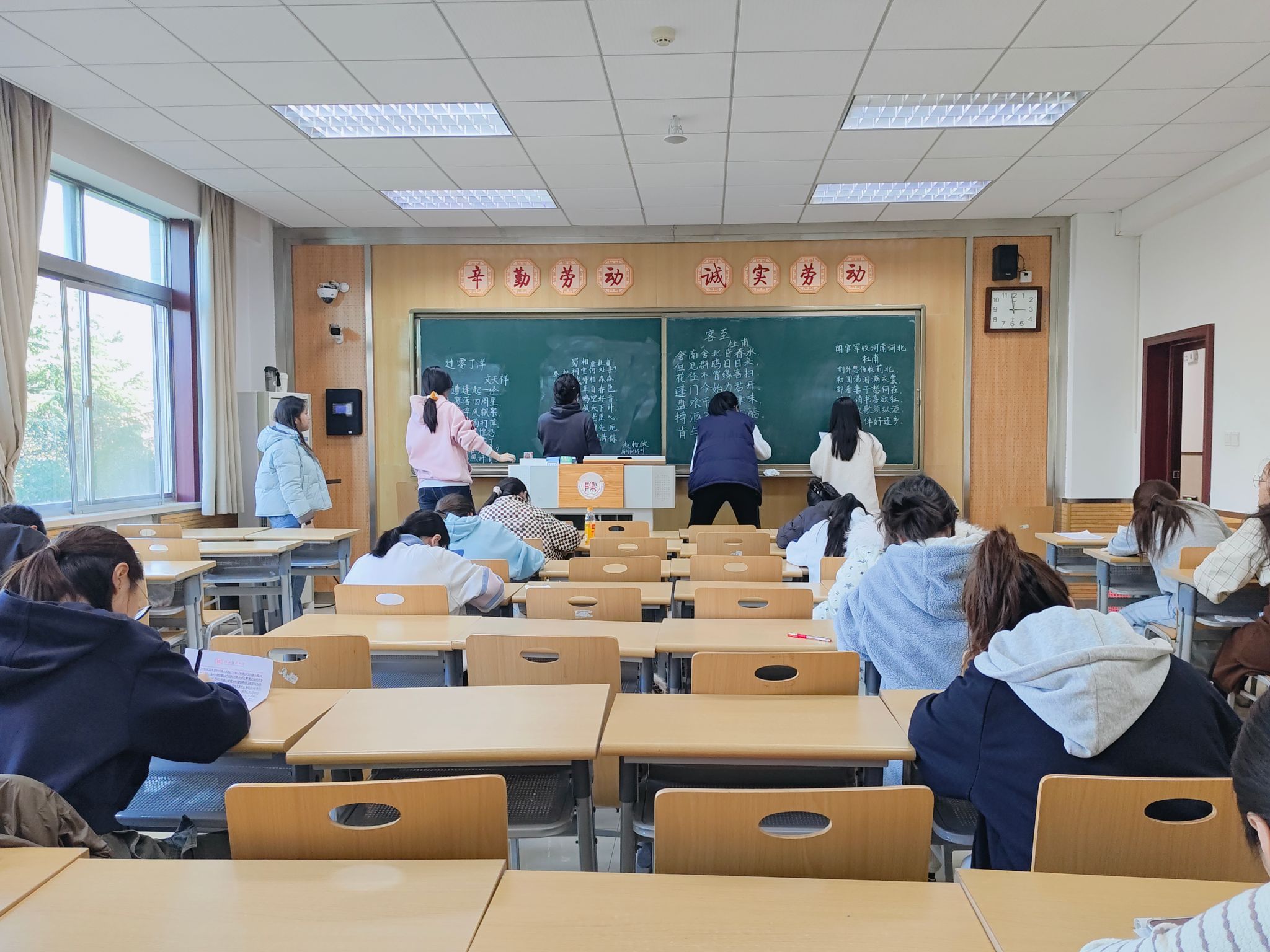 比赛内容设计兼具思想深度与文化厚度,书写选题涵盖毛泽东主席经典诗词、《中共中央关于党的百年奋斗重大成就和历史经验的决议》(第三个历史决议)关键段落以及历代经典古诗七言绝句,充分彰显思想政治引领和中华优秀传统文化底蕴,引导同学们坚定理想信念、牢记初心使命。一画一锋藏起伏,一笔一点见真章。赛场上,同学们各展所长,尽显书法之美。硬笔遒劲展豪气,毛笔婉转绘诗韵,粉笔工整显师风。