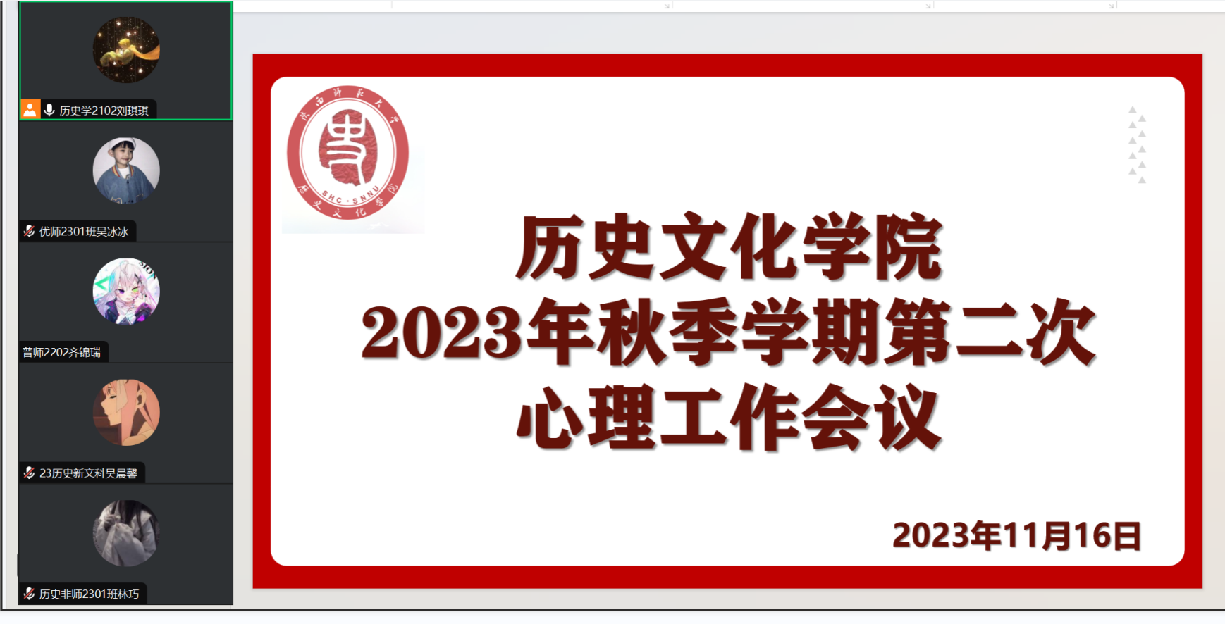 11月16日晚,威廉williamhill体育2023年秋季学期第二次心理工作会议在线上召开。会议邀请我院2023年优秀心理委员王星懿进行分享,学院心理辅导站助理,全体心理委员参加会议。