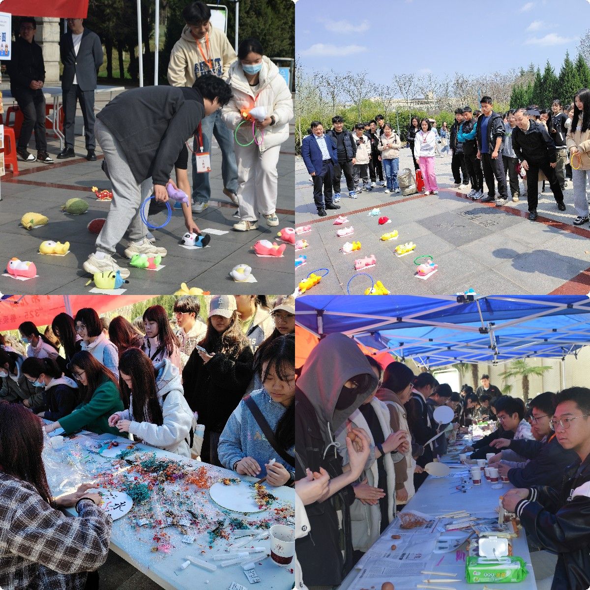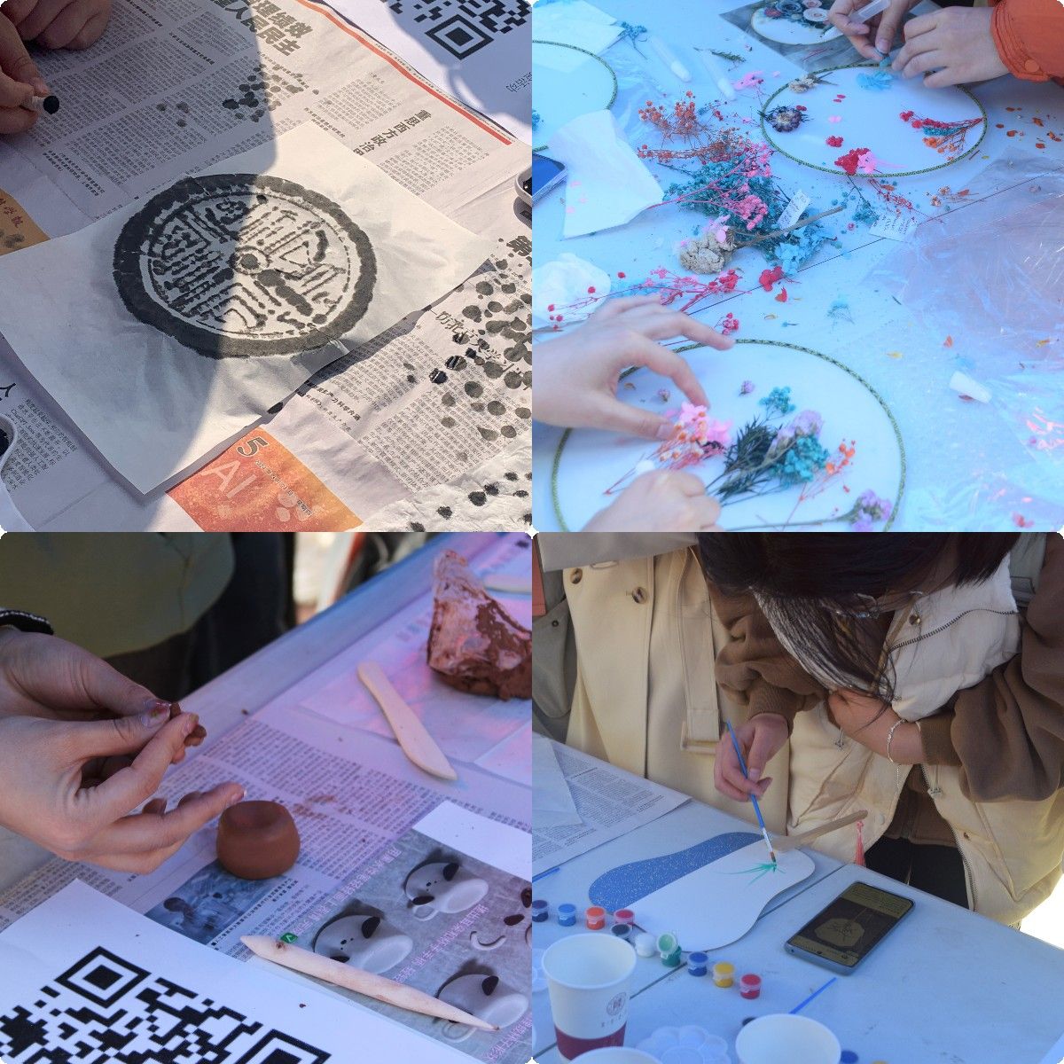 活动现场设置有泥塑手工、团扇绘制、瓦当拓印及魔力套圈、心灵疗愈等多个体验展位。同学们自觉排队参与,充分发挥巧思和创意,用灵巧的双手舞动出栩栩如生的泥塑作品,将盎然的春色绘制在形式多样的团扇之上,于瓦当拓印的历史传承中寻找文化脉络,在细致的观察和敏捷的反应中套中心仪的玩偶……