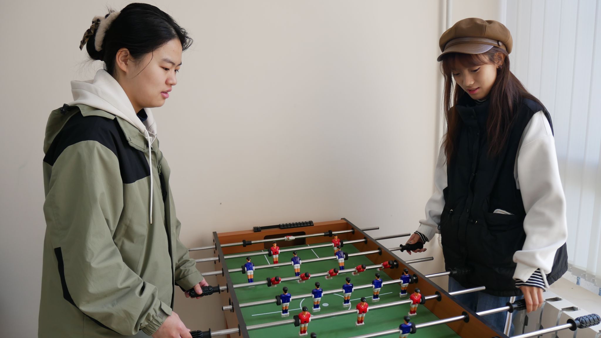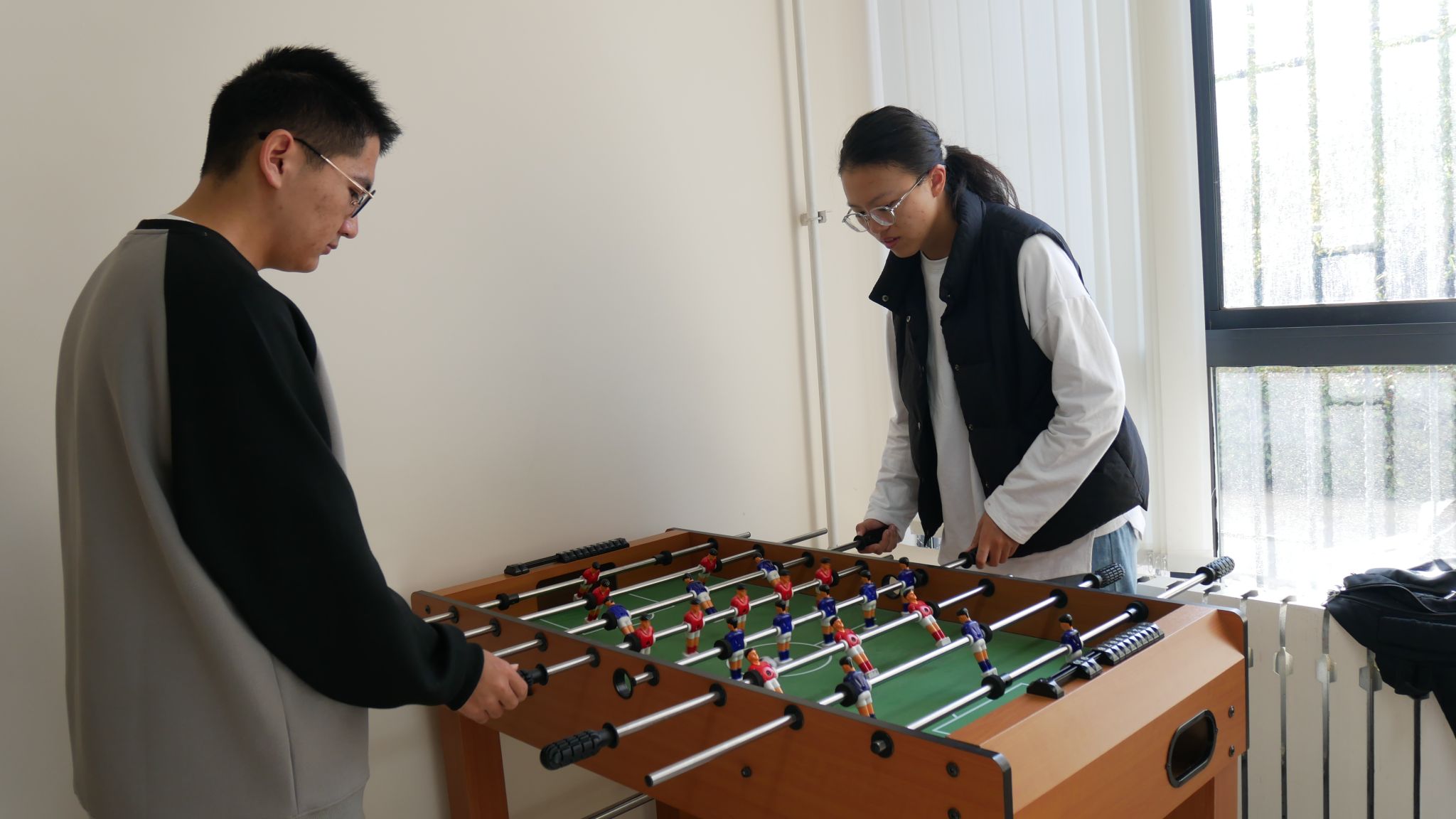 同学们自行两两分组,认真备战、蓄势待发,在足球桌上尽情发挥进攻与防守的智慧,在对战当中收获胜利与友谊的果实。比赛进行的过程中,对战的同学全神贯注,不敢有一刻松懈,观战的同学也随着场上同学的高超球技而喝彩欢呼,现场氛围热烈而活跃