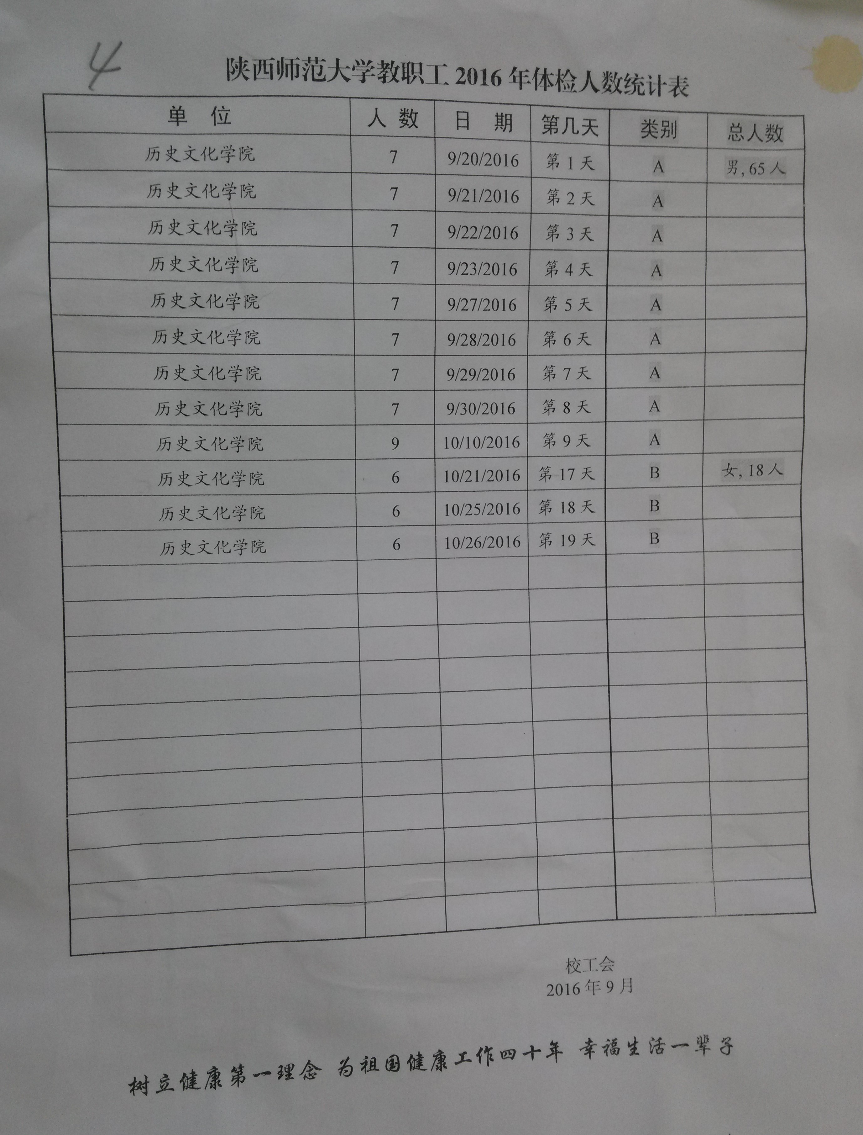 根据校工会有关通知(http://www.snnu.edu.cn/inf.php?id=15737),近期我校将为教师进行年度体检。今年我院男教工体检安排在雁塔校区,女教工安排在长安校区。具体日期如下: