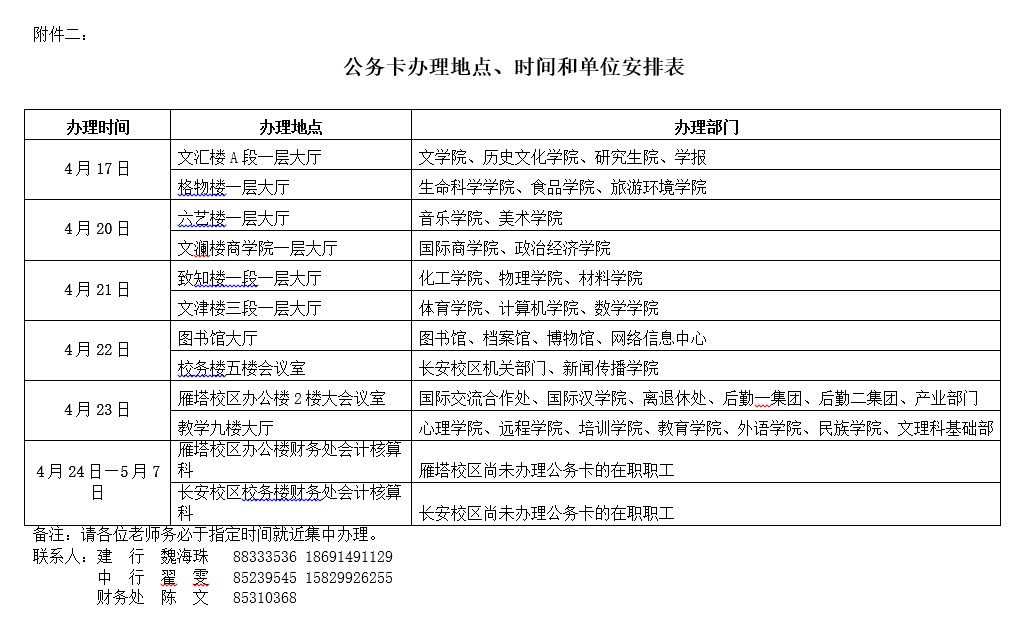公务卡办理地点、时间和单位安排表