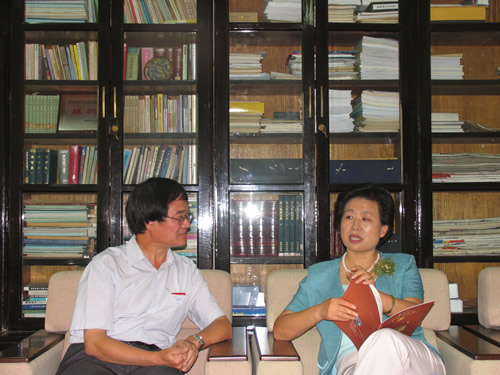 朱静芝副省长以鲜花向贾二强教授首先致以问候,说:陕西师范大学是教师的摇篮,培养了无数品质优良的学生,希望通过你向陕西师范大学全体教师致以节日问候。之后,双方进行了亲切的座谈,朱副省长关切地询问了学院教师的生活、学习,以及学院学科建设状况,尤其是重点学科以及全国百篇优博论文取得的成果。座谈气氛喜悦、和谐。
