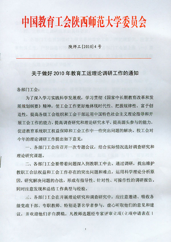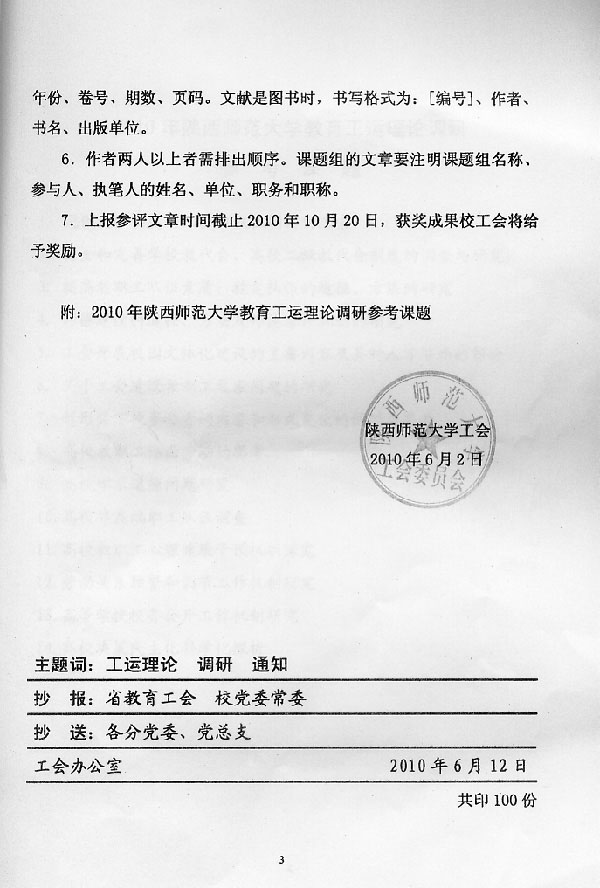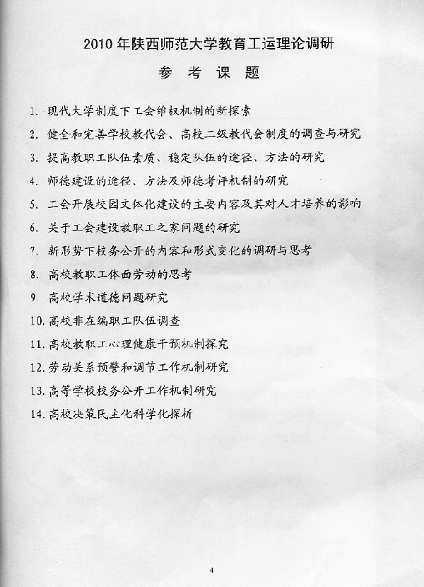 各位老师:2010年陕西师范大学教育工运理论征文活动调研参考课题已贴在网上,请各位老师积极参与征文活动。