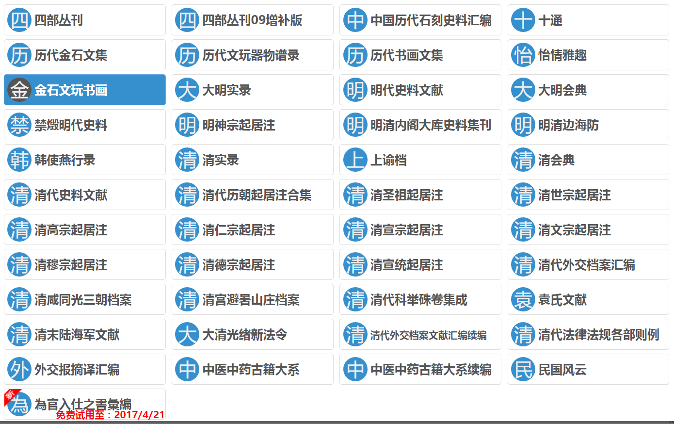 书同文公司现为我校开通其全部古籍数据库的免费试用,包括四部丛刊、中国历代石刻史料汇编、大明实录、清实录等,请大家积极使用。