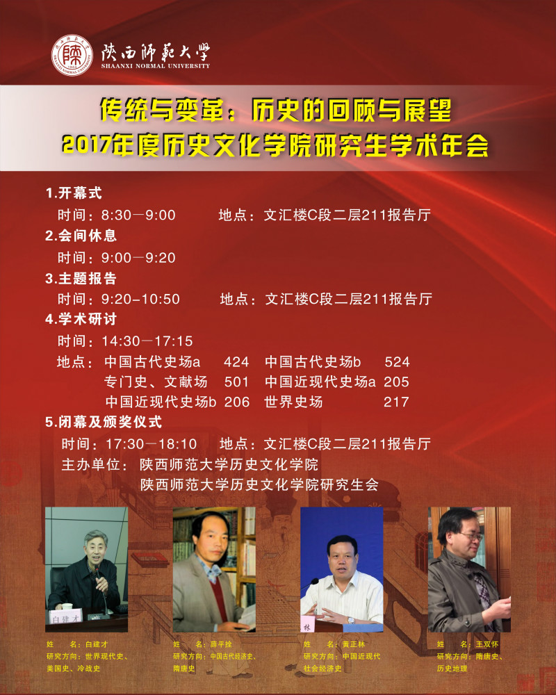 为了营造良好的学术氛围,鼓励研究生积极进行学术创作,秉承我院“自由、自信、自尊、自强”的院训,兹定于2018年1月13日上午8:30于陕西师范大学长安校区文汇楼C段二层211报告厅举办2017年度威廉williamhill体育“传统与变革:历史的回顾与展望”研究生学术年会,诚挚邀请各位老师和同学的到来!