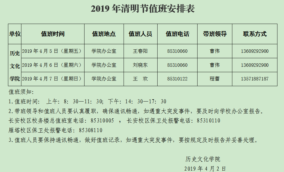 学院2019年清明节值班安排