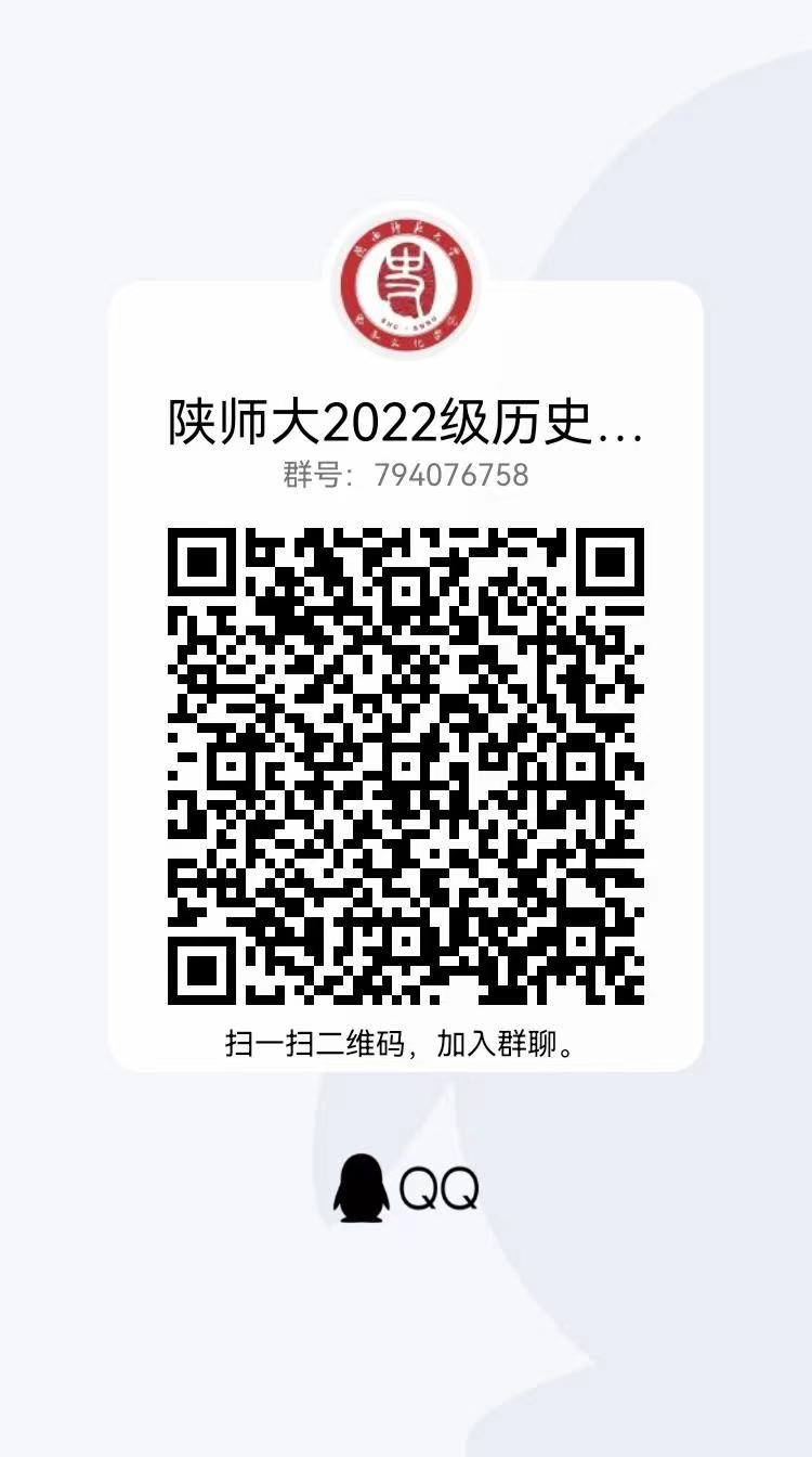 为帮助同学们提前熟悉学校,适应大学生活,做好开学准备工作,搭建新生与学院、老师沟通交流的平台,学院特建立2022级本科生QQ群(群二维码见下图)。请各位新生同学扫码加入QQ群并及时修改自己的群备注为:姓名-专业-联系方式(示例:赵某-历史学-公费师范生-12345678900)。