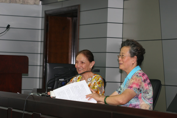 克拉拉教授现已70多岁,但仍充满活力。她通晓六国语言,先后在哈萨克斯坦总统战略研究所和卡奈尔大学工作。同时,她也非常关注中国历史、人文、教育等领域的相关问题。刘戈教授首先为现场学生简要地介绍了克拉拉教授近些年的科研成果和访学经历。接下来,克拉拉教授对同学们讲解了哈萨克斯坦的汉语研究现状,并对怎样查找新疆档案,各地区的档案分布状况做了系统的分析,同时也补充说明了现阶段研究领域的最新探索成果。她指出自1991年哈萨克斯坦国立大学成立汉语中心以来,中国对哈萨克斯坦提供了很大的帮助,推进了中哈两国的文化交流。此外,现在越来越多的哈萨克斯坦青年热衷于学汉语,除俄语外,汉语已成为哈萨克斯坦的第二大语言。