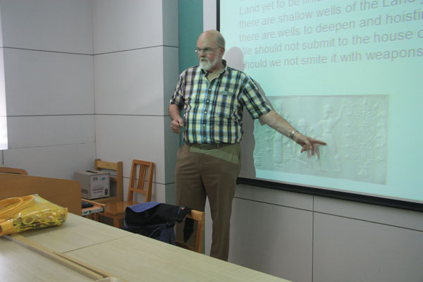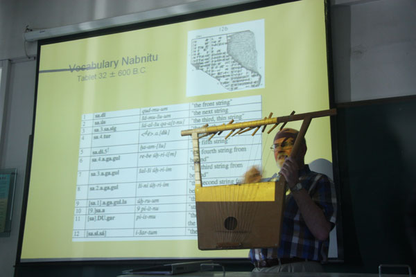 在讲座中,克里斯潘博士首先图文并茂地介绍了古代苏美尔的楔形文字、国王故事、学校音乐考试的试卷、以及音乐演奏的乐器和场景等内容,然后详细地介绍了一首祈祷歌,表达了一位母亲以向神祈求,希望能够拥有一个孩子的美好心愿。最后,克里斯潘博士用古老的语言和古老的多弦琴为我们现场弹唱了这首动人的音乐,感染了在场的每个老师和同学。